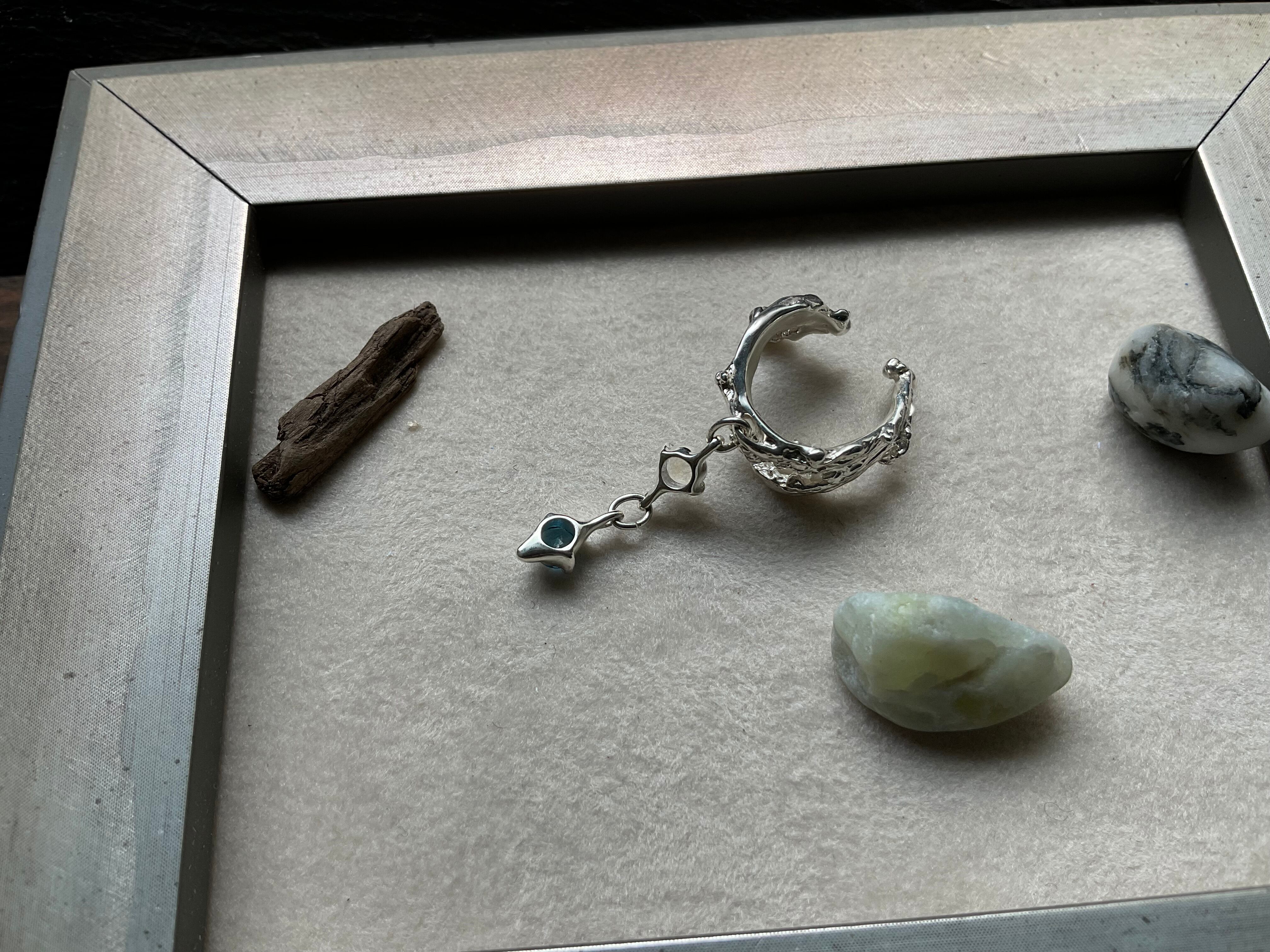 当店水モチーフのイヤカフに、3、5mmのラウンドカットルースと組み合わせ、耳元でキラキラとした雫がこぼれ落ちるようなイメージで構成しています。青みのあるシラーの入った、月を思わせるムーンストーンが上に、雫型枠にはめられた夜色のようなロンドンブルートパーズが下に揺れる作品です。