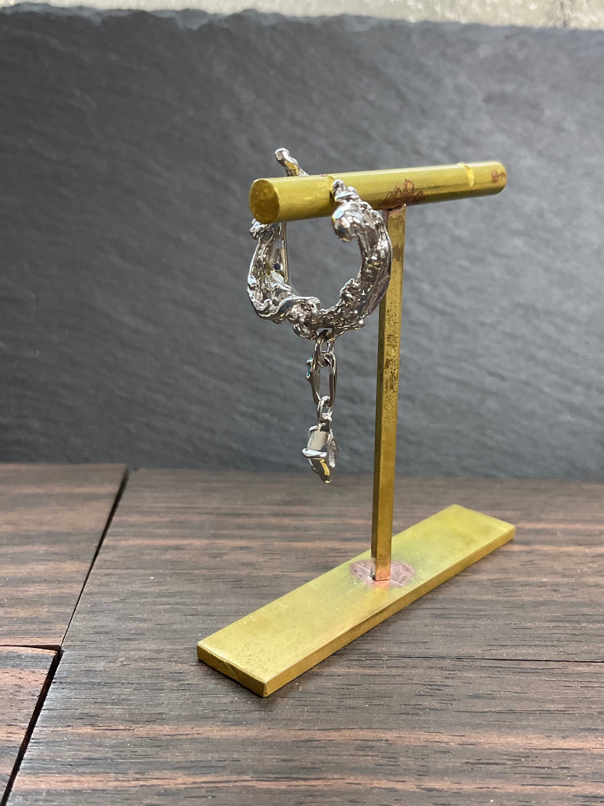 プラチナならではの水の輝きとお持ち寄りいただいた石たちのおかげで一層煌めく作品に仕上がりました。(こちらの作品は埋め込み石の関係などからお客様ご希望により左耳専用でつくっています。)