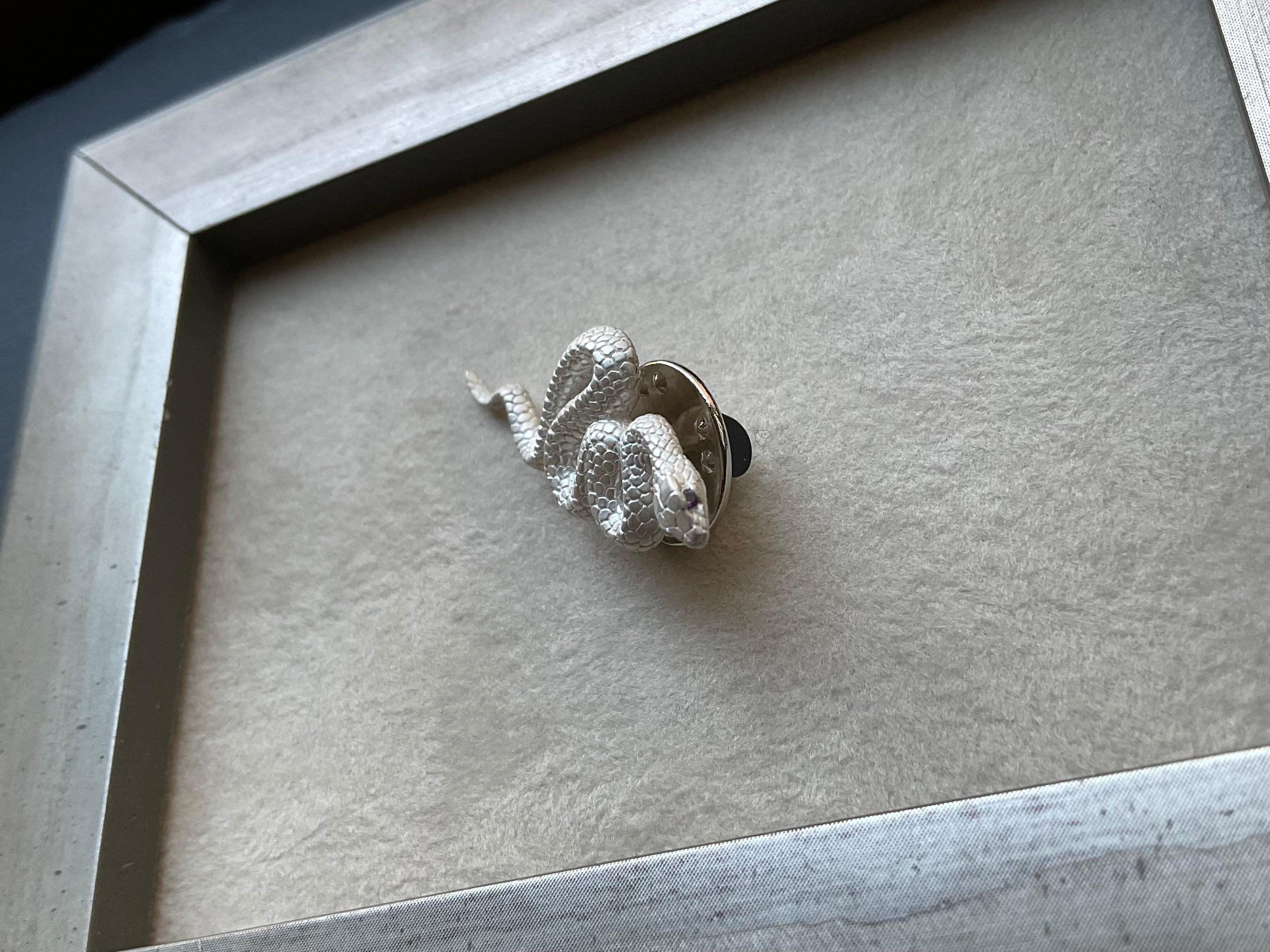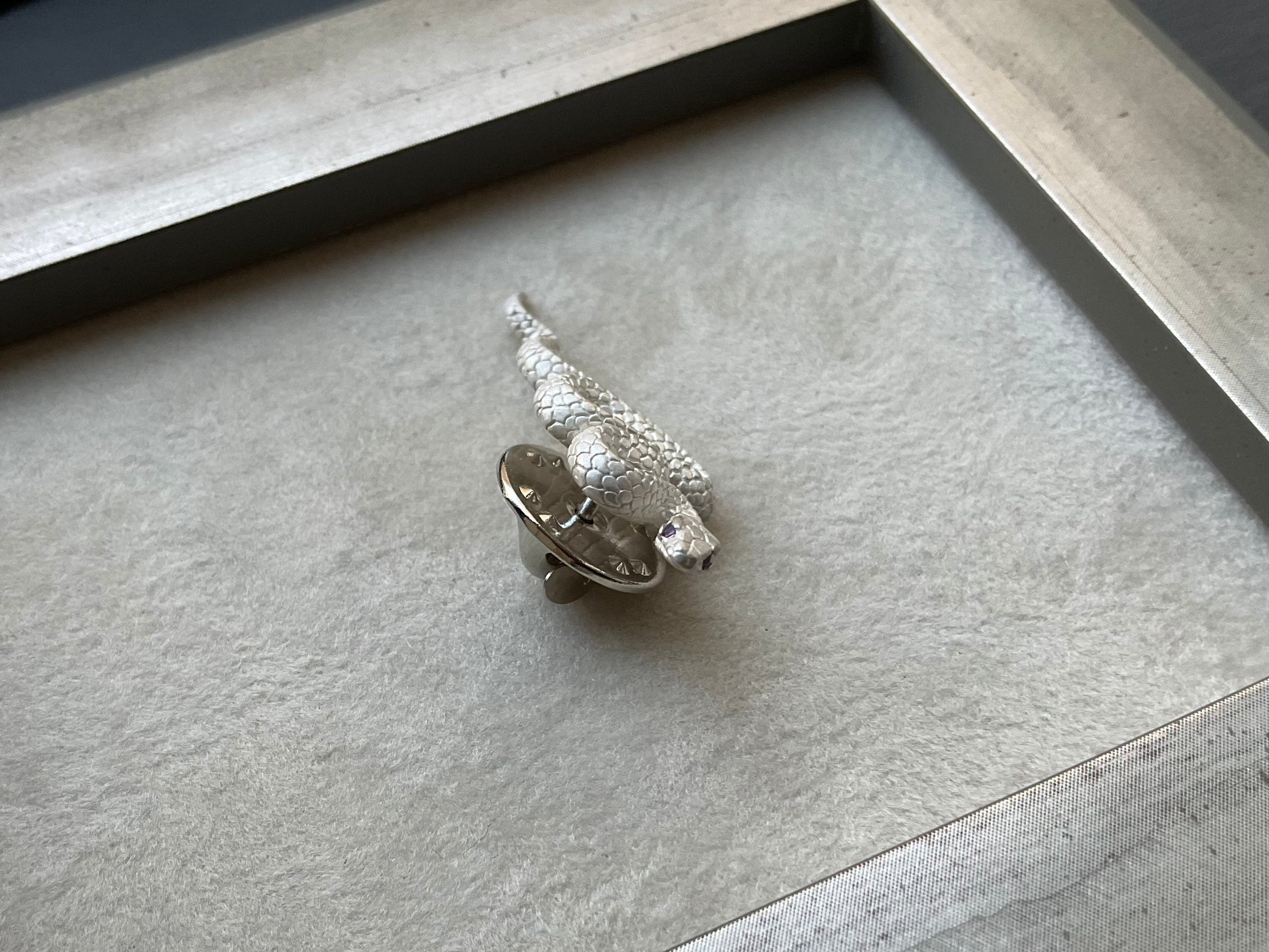 細部にまで拘って作った白蛇のブローチの眼に1、0mmアメシストメレを嵌め込んだ作品です。優しい色合いの紫色の眼が魅力的な作品です。裏側もしっかり作り上げていて今にも動き出しそうなリアル感があり、銀のみせる自然な白さも好まれています作品です。