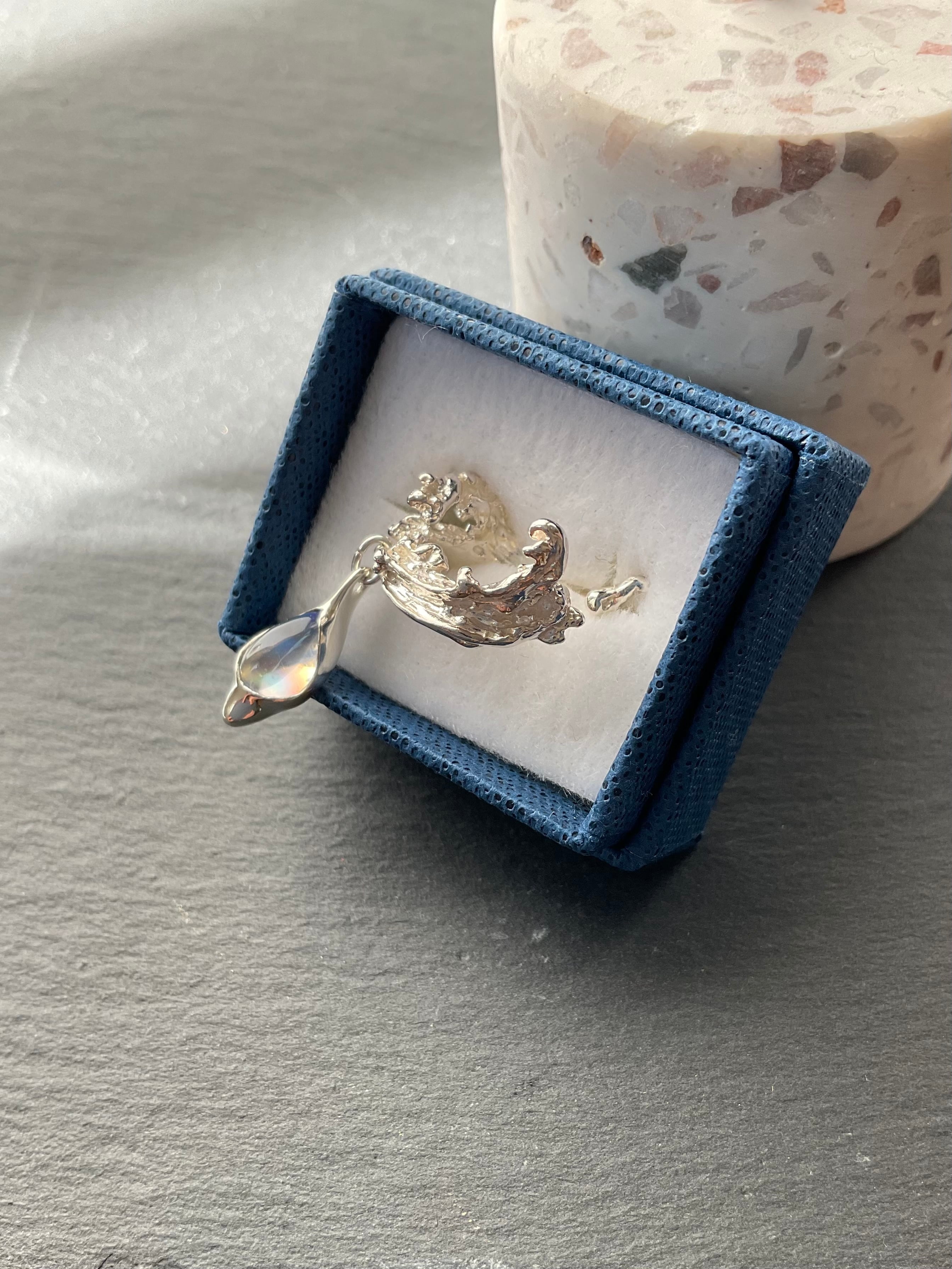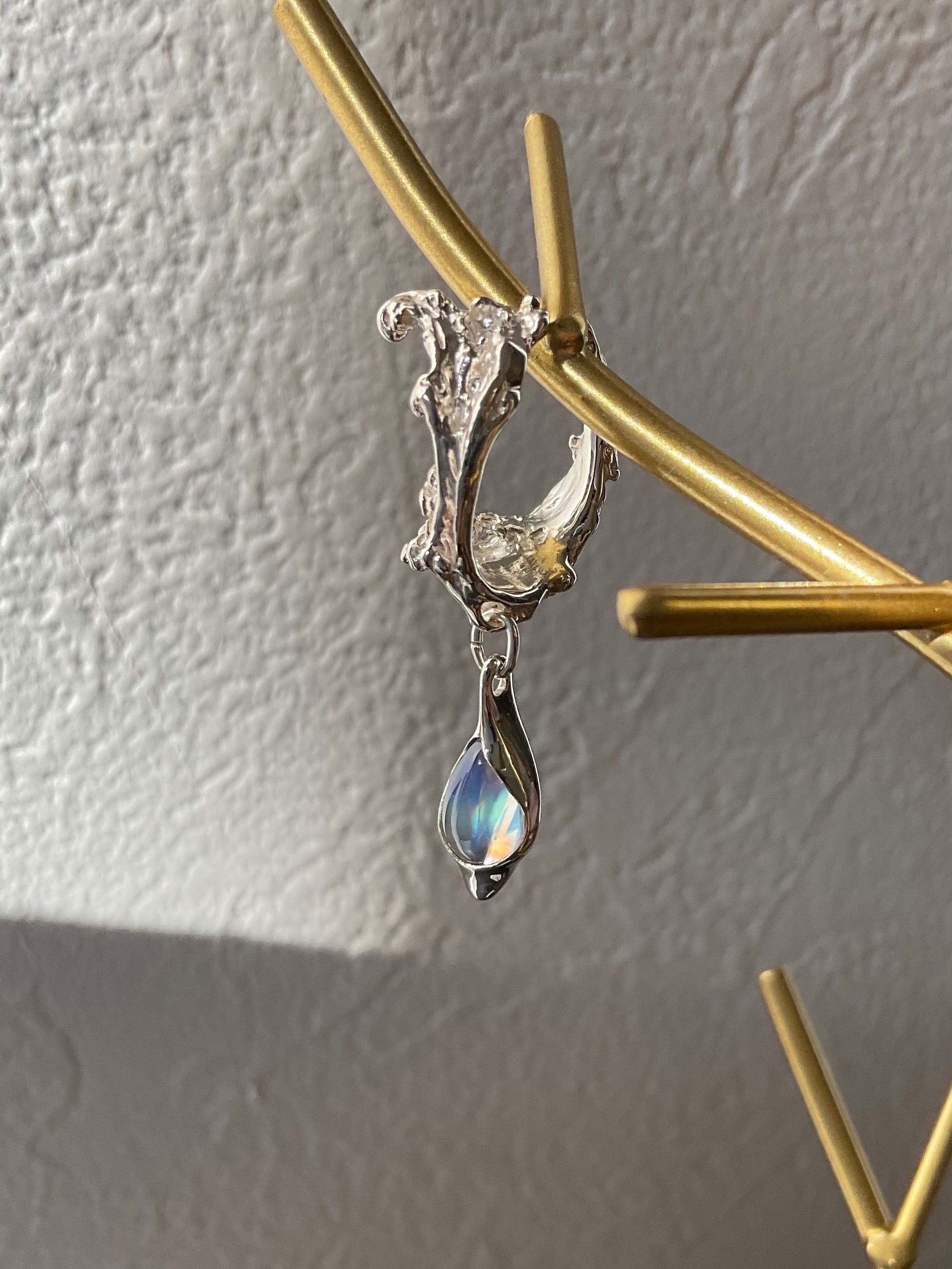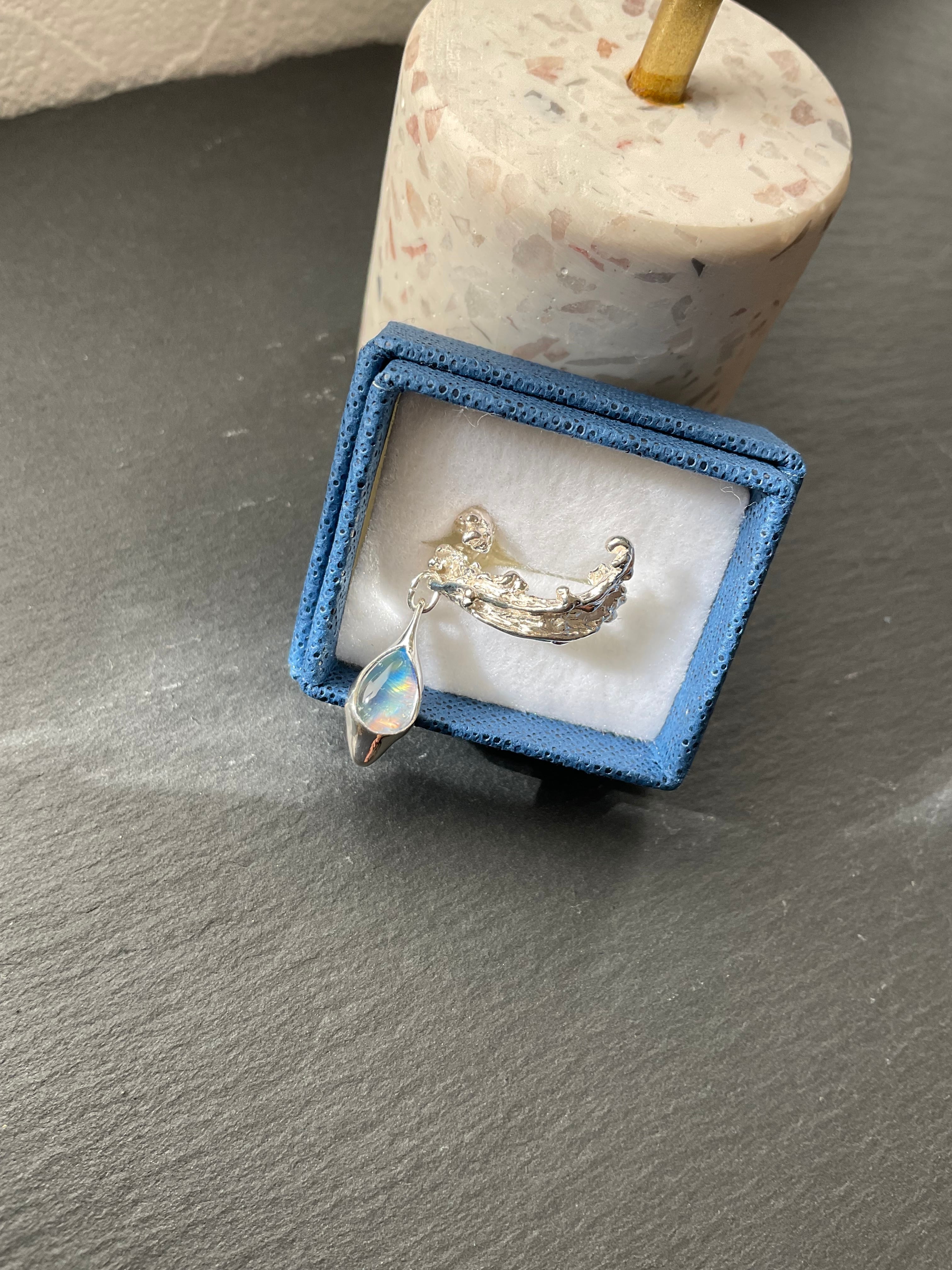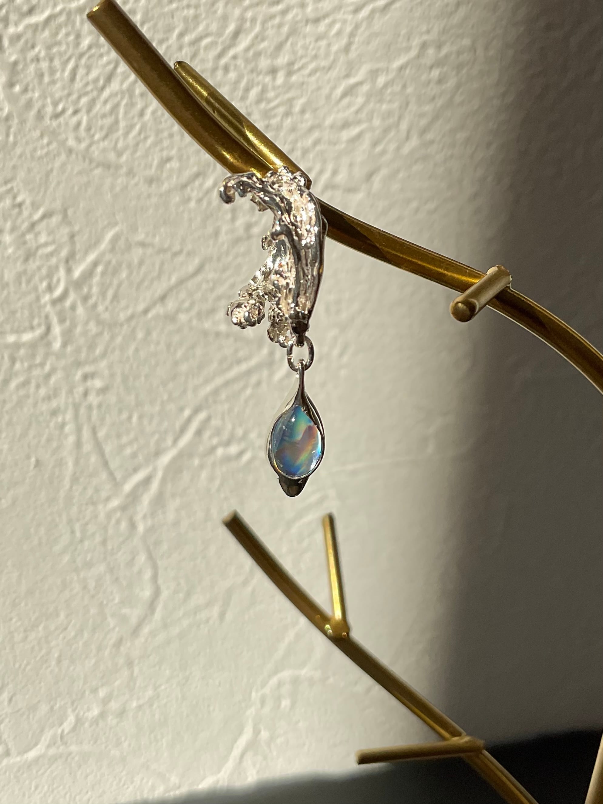 水モチーフのイヤカフです。水が静かに流れ、うねっていく様をそのままイヤカフに込めました。さらにこちらは人気シリーズで涙型ラブラドライトルースと組み合わせ、水滴、雫がこぼれ落ちる瞬間のようなイメージでお作りしており、角度で雫の形の見え方や色味も変化します。青みのあるシラーの変化が美しいラブラドライトの入った作品です。