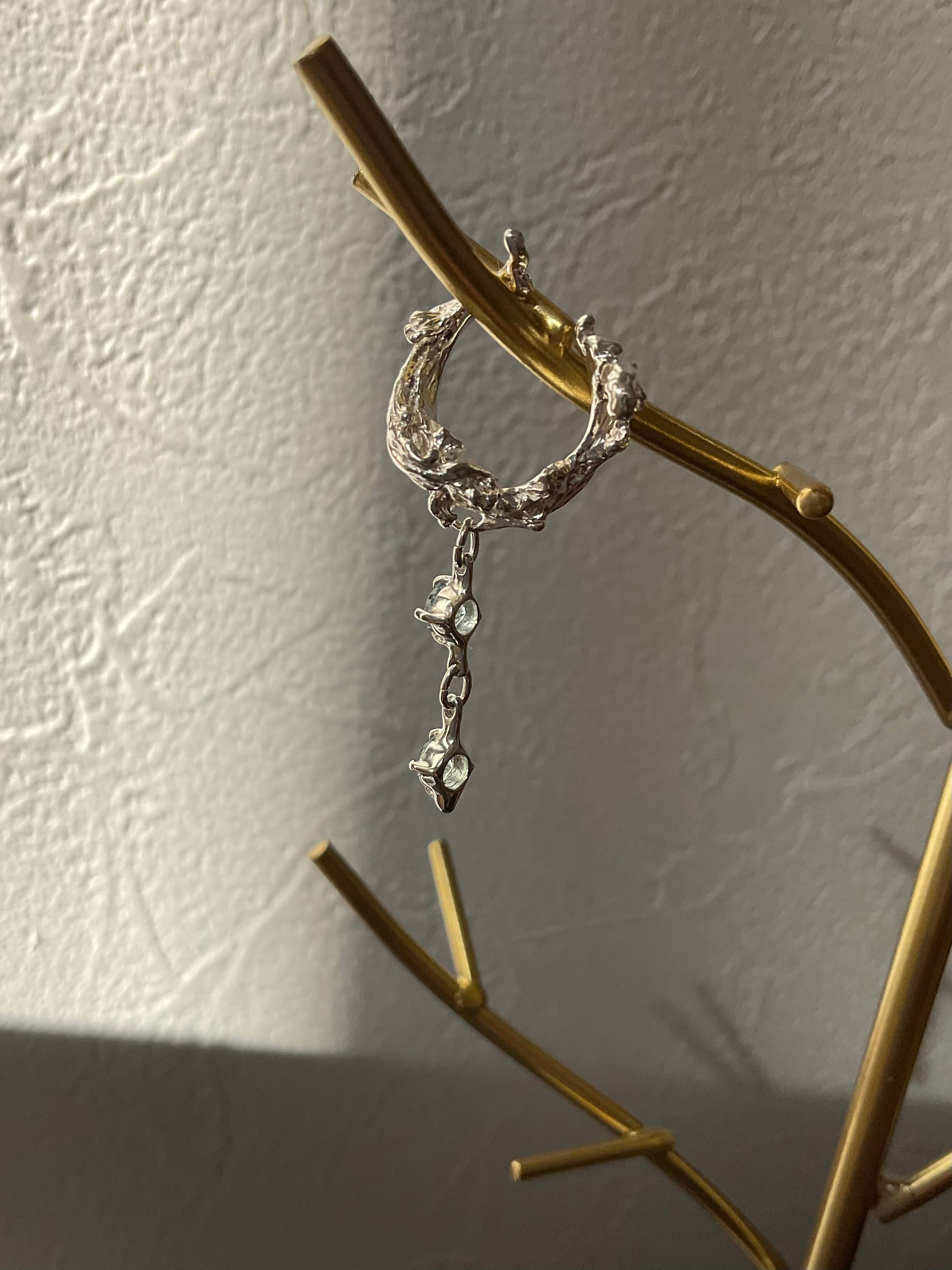 当店水モチーフのイヤカフに、3、5mmのラウンドカットルースと組み合わせ、耳元でキラキラとした雫がこぼれ落ちるようなイメージで構成しています。爽やかな水を感じるような色合いの二連で、軽やかに揺れて耳元で輝きます。