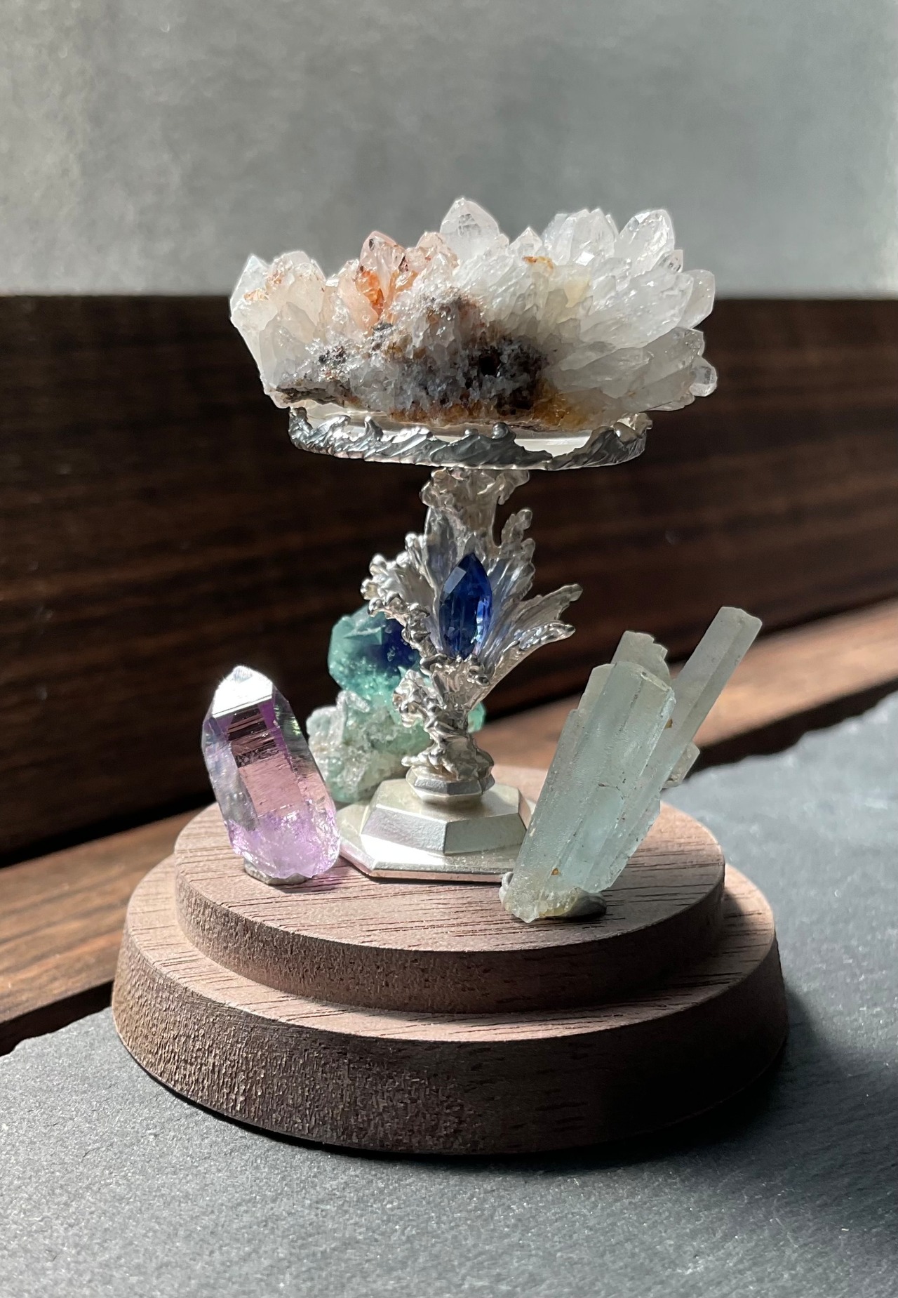 当店人気商品もである水台座にさらにその上に泉のような、ガラスをベースとした円形の台座が飾られています。通常の台座たちより大きなサイズの作品となっています。上部ガラス面が直径20mmなので、置ける標本やルースの幅もだいぶ広がり、下の台座部分にもお好きな石を飾ることもできます。好きな石の一点置きもよし、石を寄せ集めて標本タックなどでバランスをとりお好みの世界を作るのもいいかもしれません。