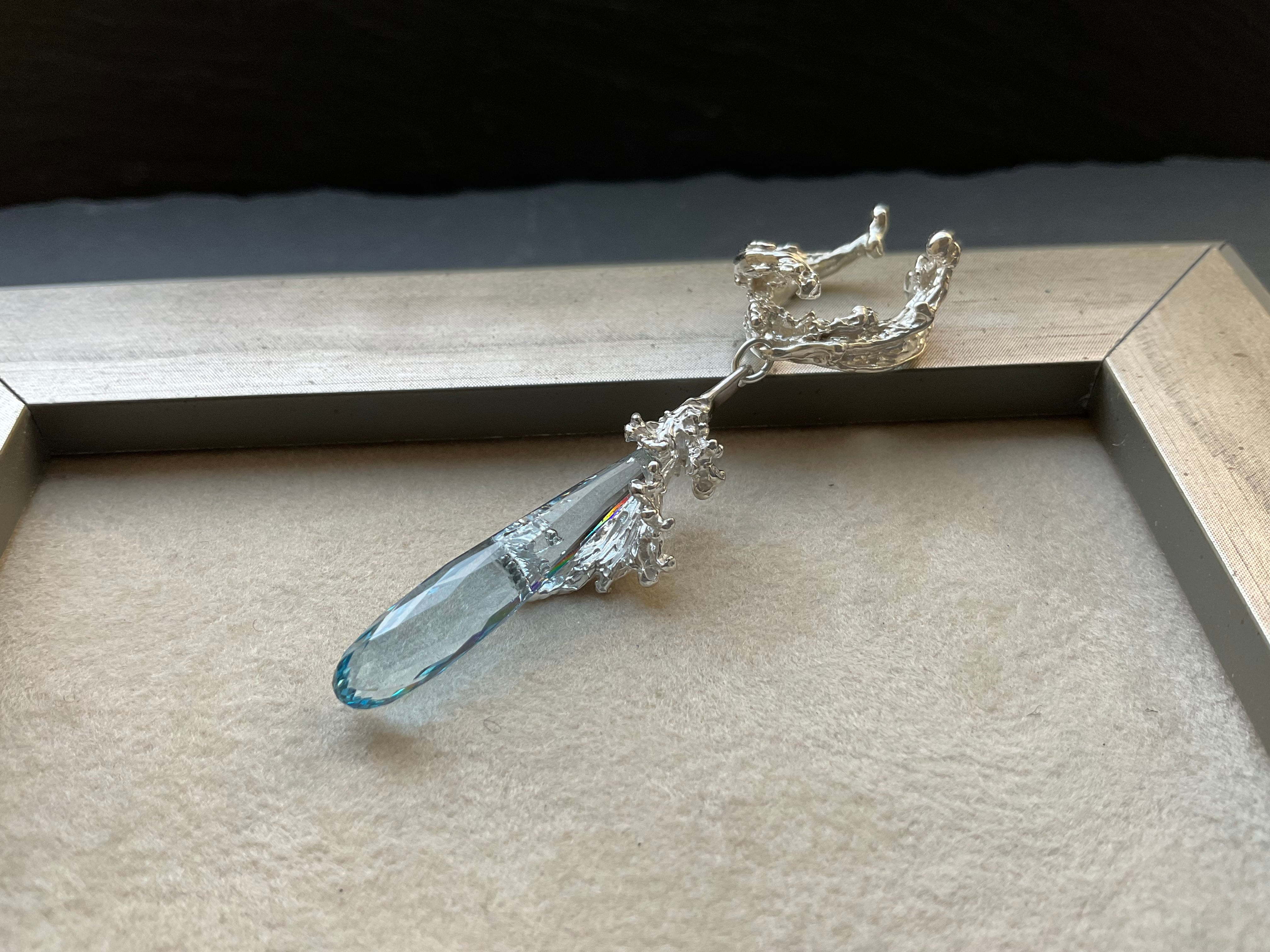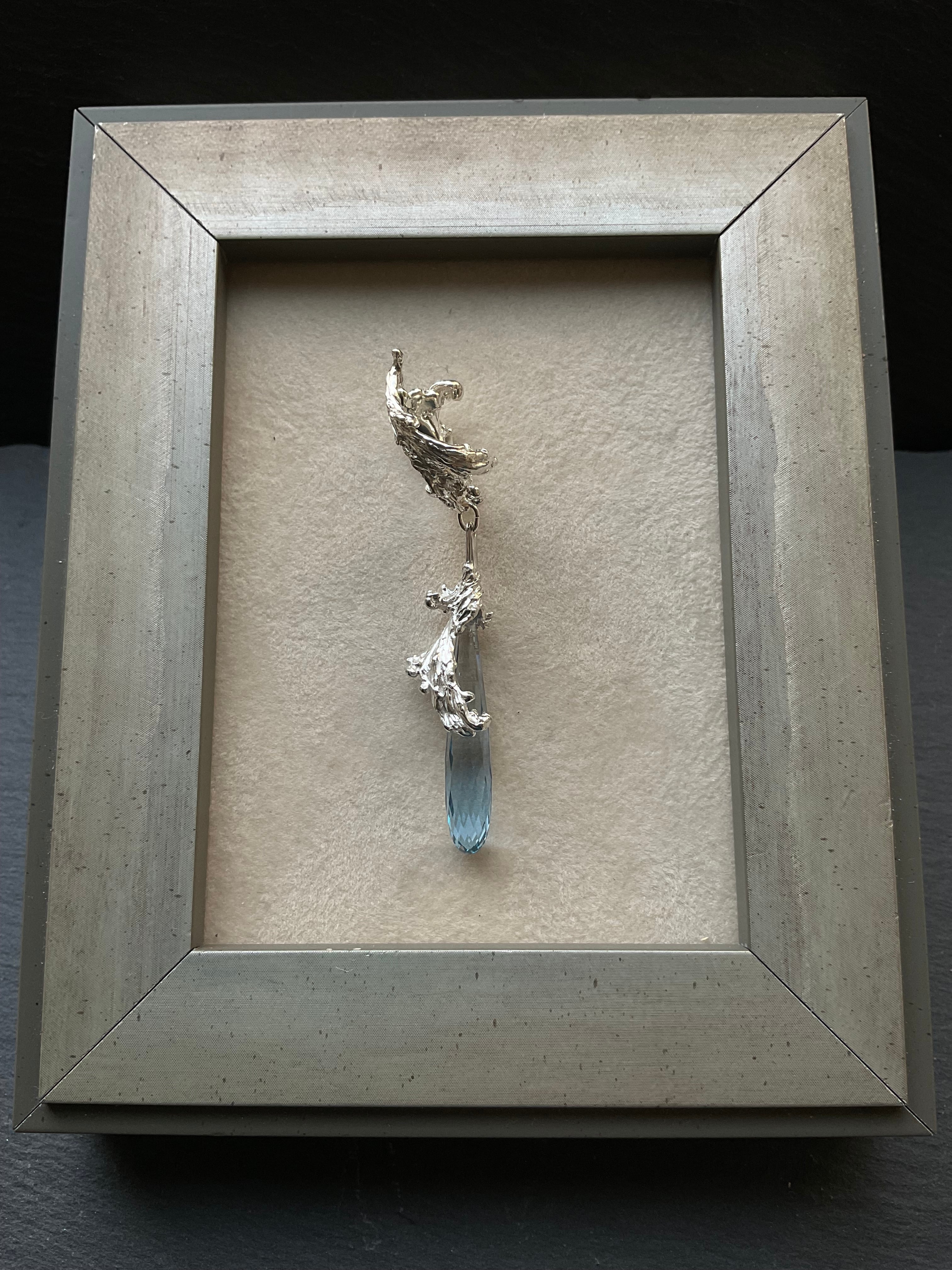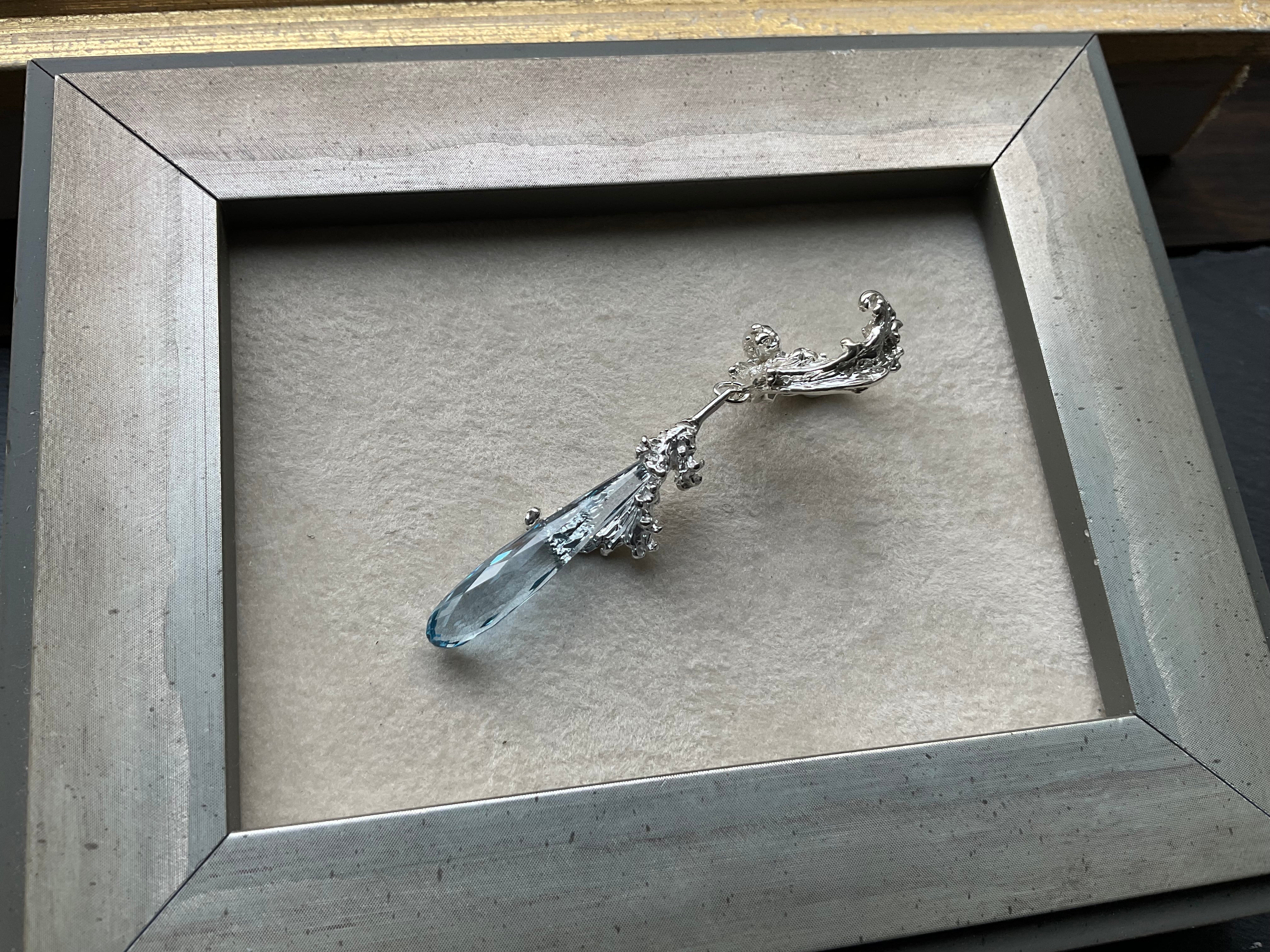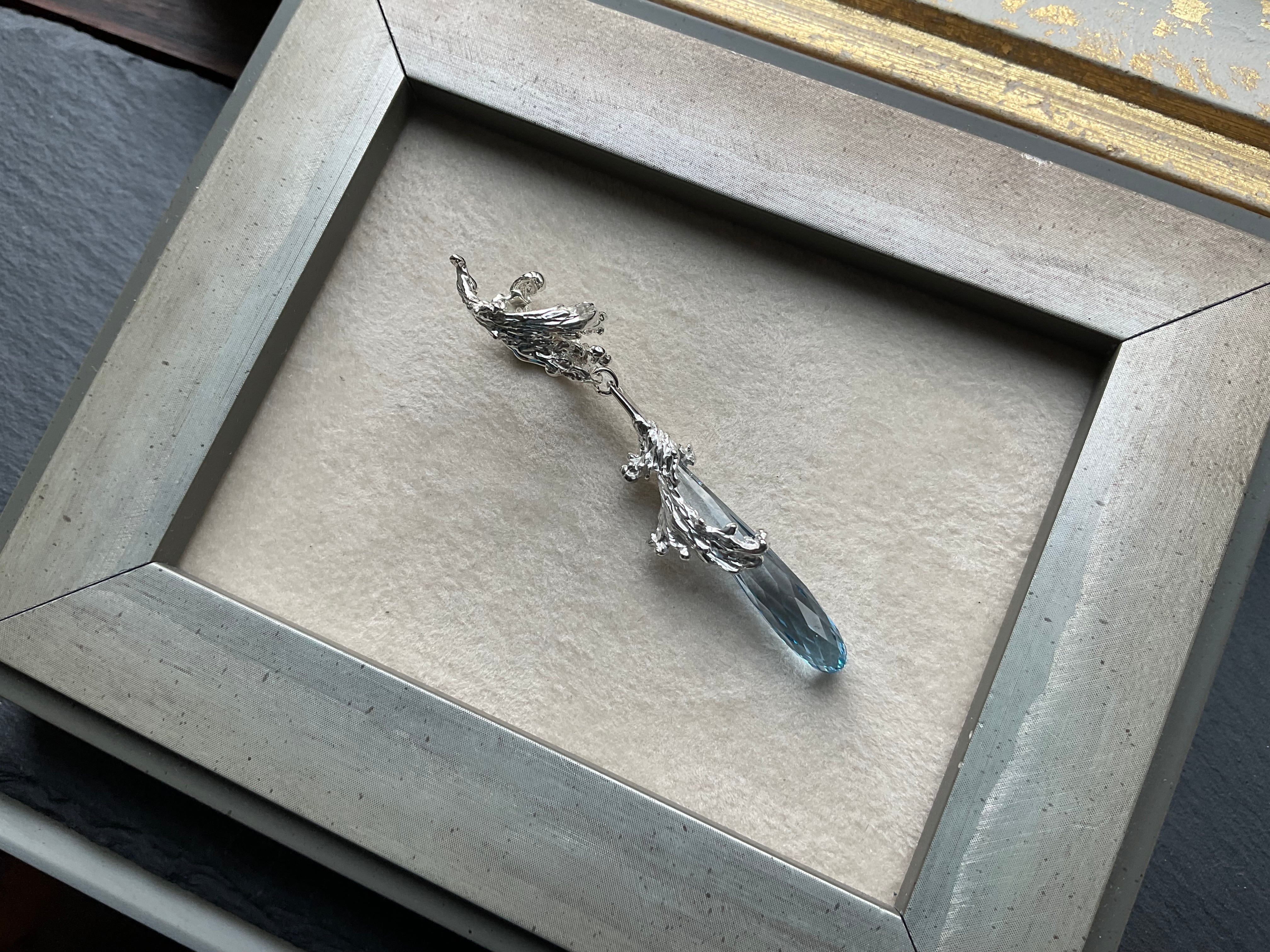 イベントにてお客様からお持ち寄りいただいた石を使用し、水台座の装飾部分を一部起用してご要望に叶うよう仕上げました。持ち寄ってくださった石の上部は接着加工用に穴が空いていたので、そこを少し隠しながらも接着し、水が石を囲うようにくるりと流れるようにとにとのことで成形しました。奥行きのある作品で接着、水モチーフとの事で下げている装飾部銀面にのみご希望にて石以外に酸化防腐剤を施しています。(こちらの作品はお客様ご希望により左耳専用でつくっています。)