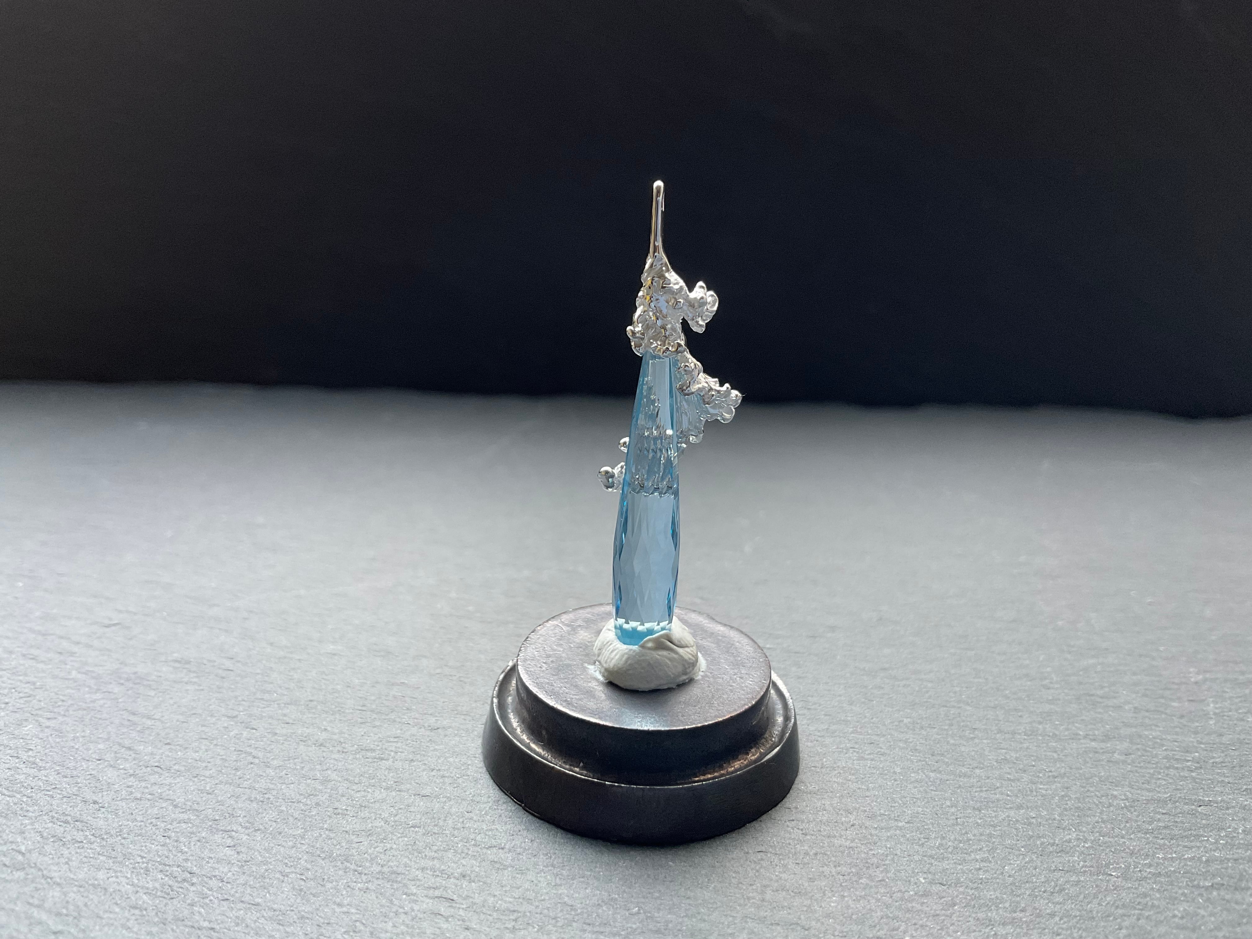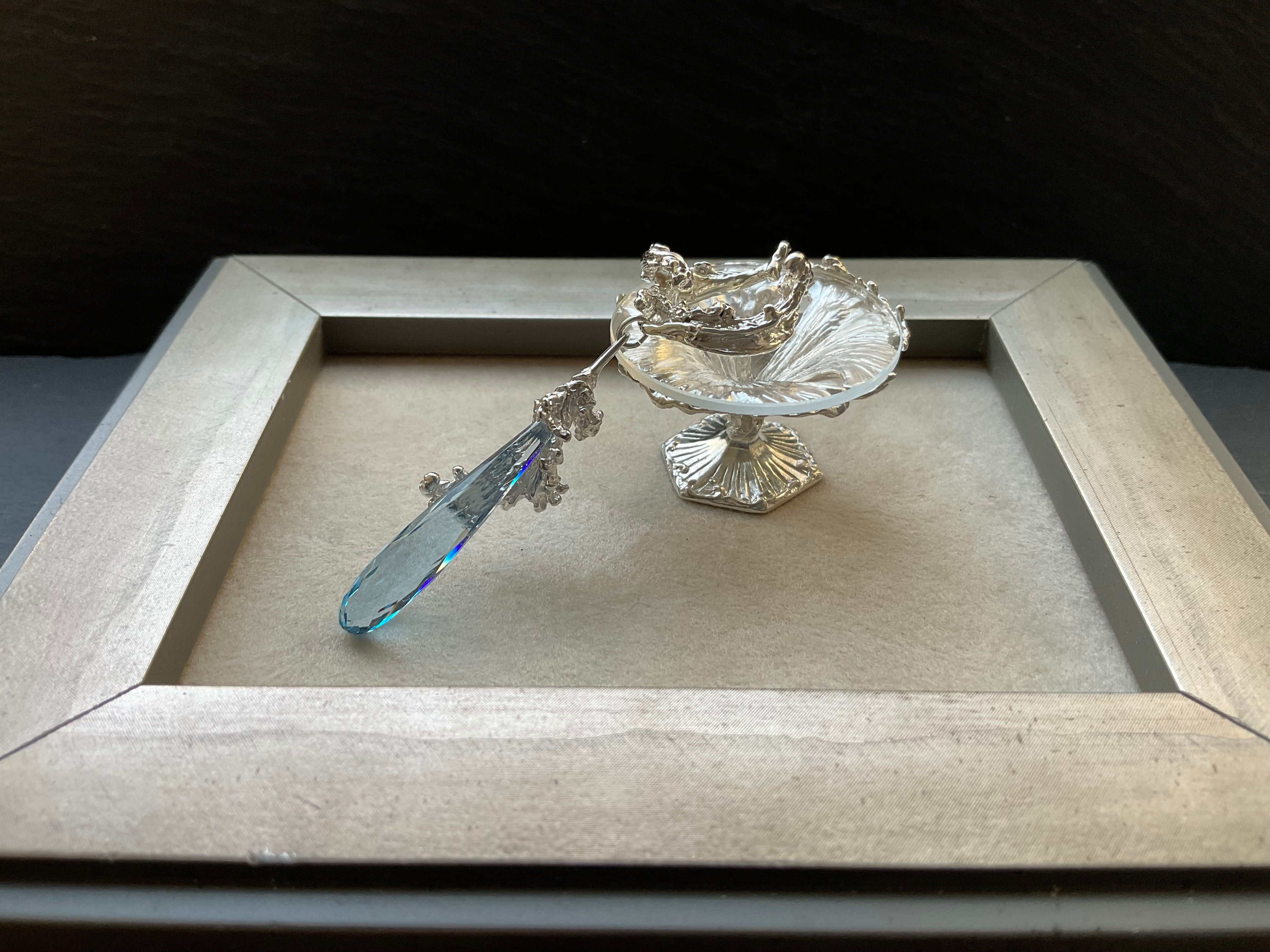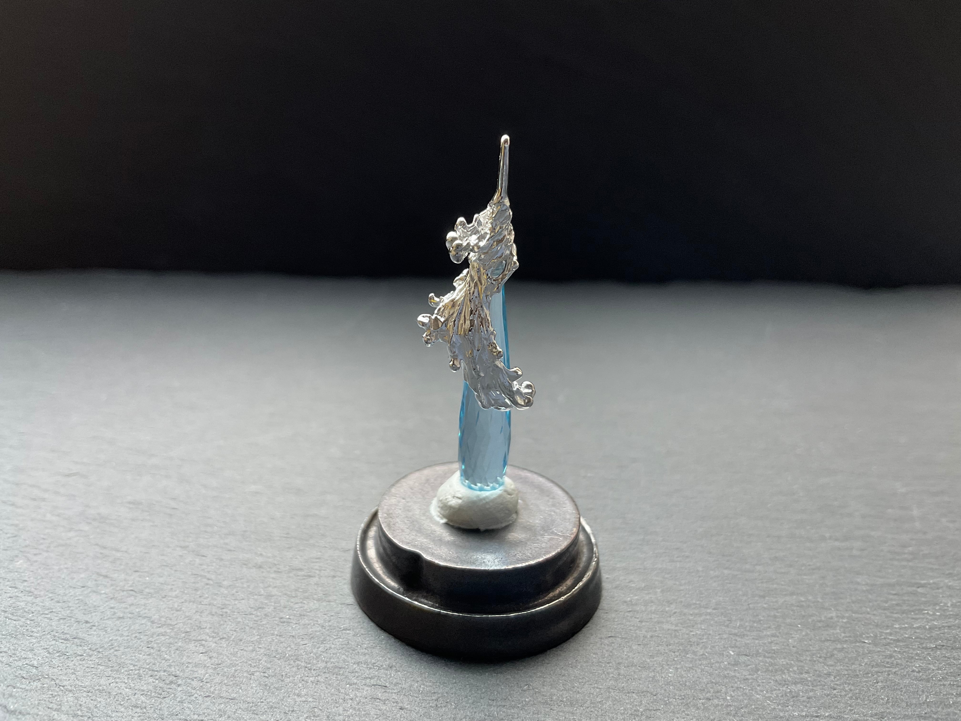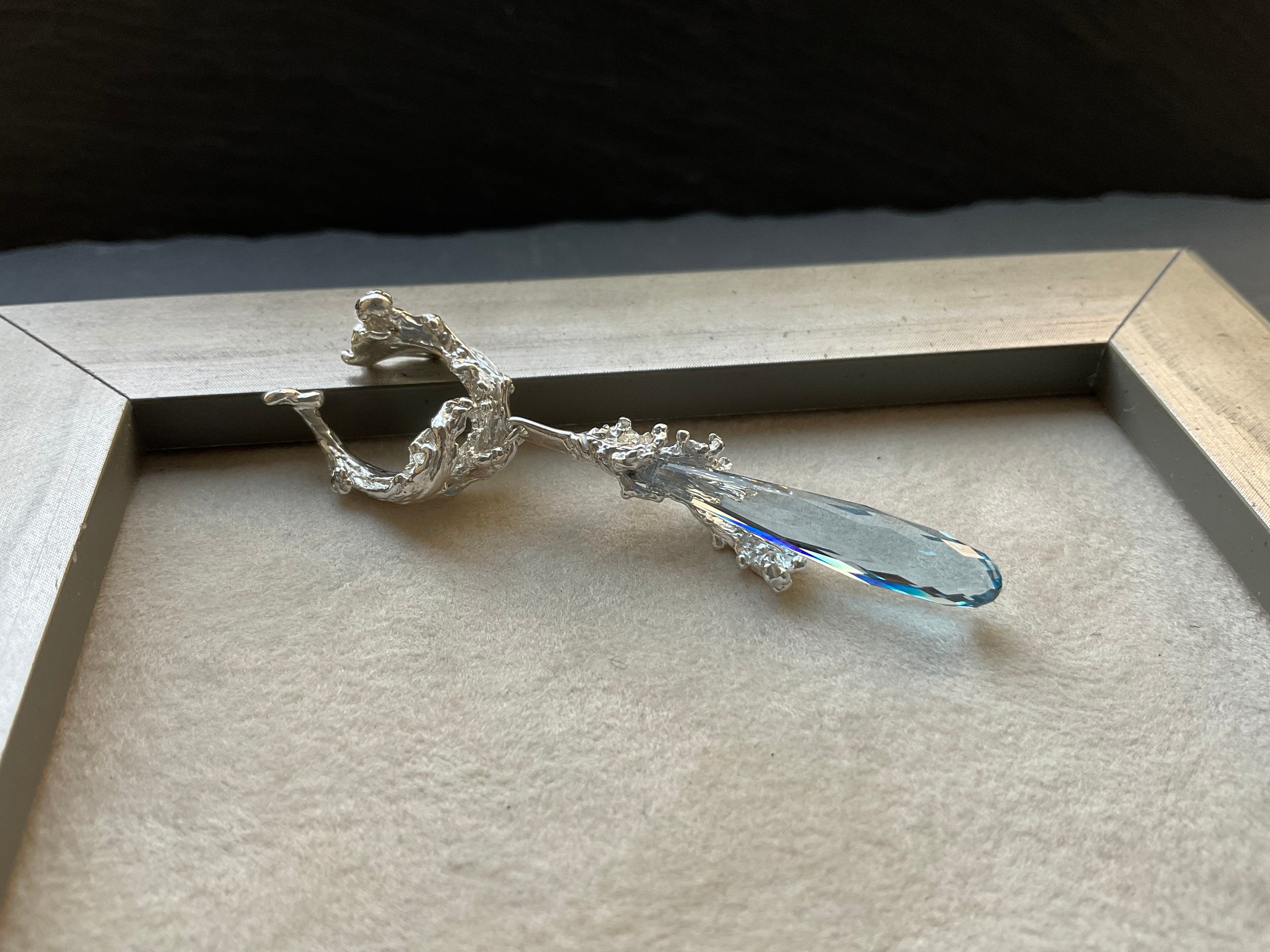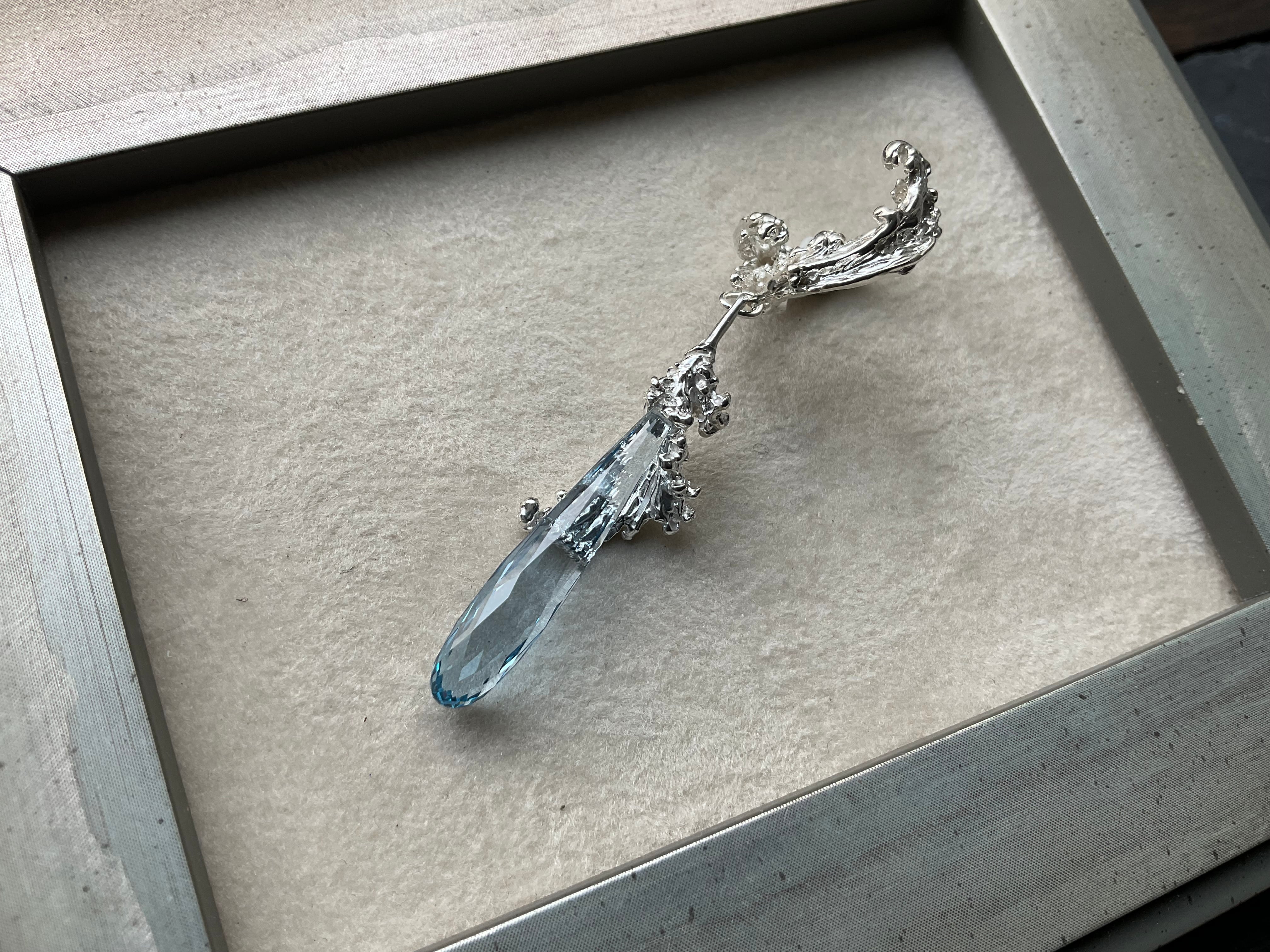 イベントにてお客様からお持ち寄りいただいた石を使用し、水台座の装飾部分を一部起用してご要望に叶うよう仕上げました。持ち寄ってくださった石の上部は接着加工用に穴が空いていたので、そこを少し隠しながらも接着し、水が石を囲うようにくるりと流れるようにとにとのことで成形しました。奥行きのある作品で接着、水モチーフとの事で下げている装飾部銀面にのみご希望にて石以外に酸化防腐剤を施しています。(こちらの作品はお客様ご希望により左耳専用でつくっています。)