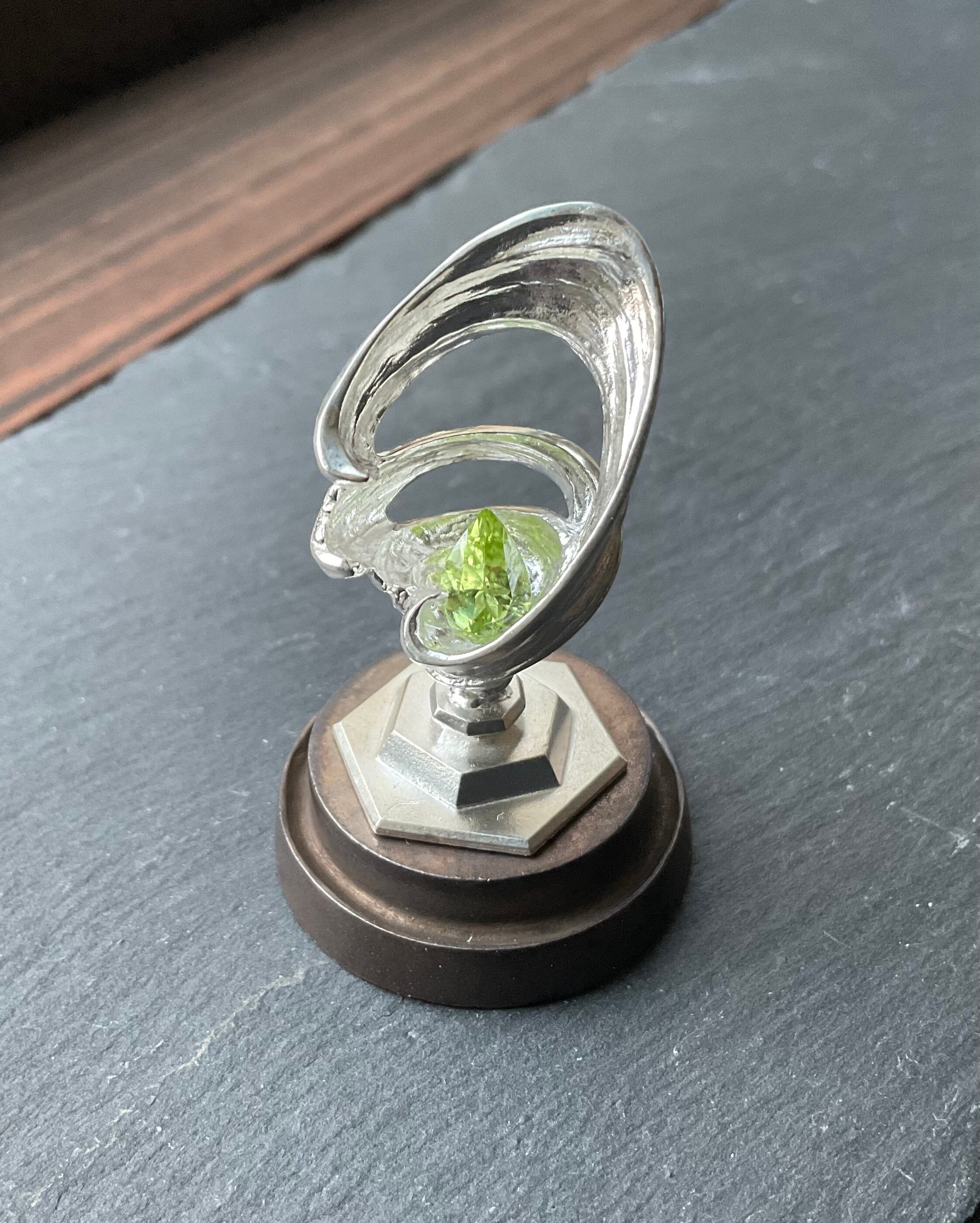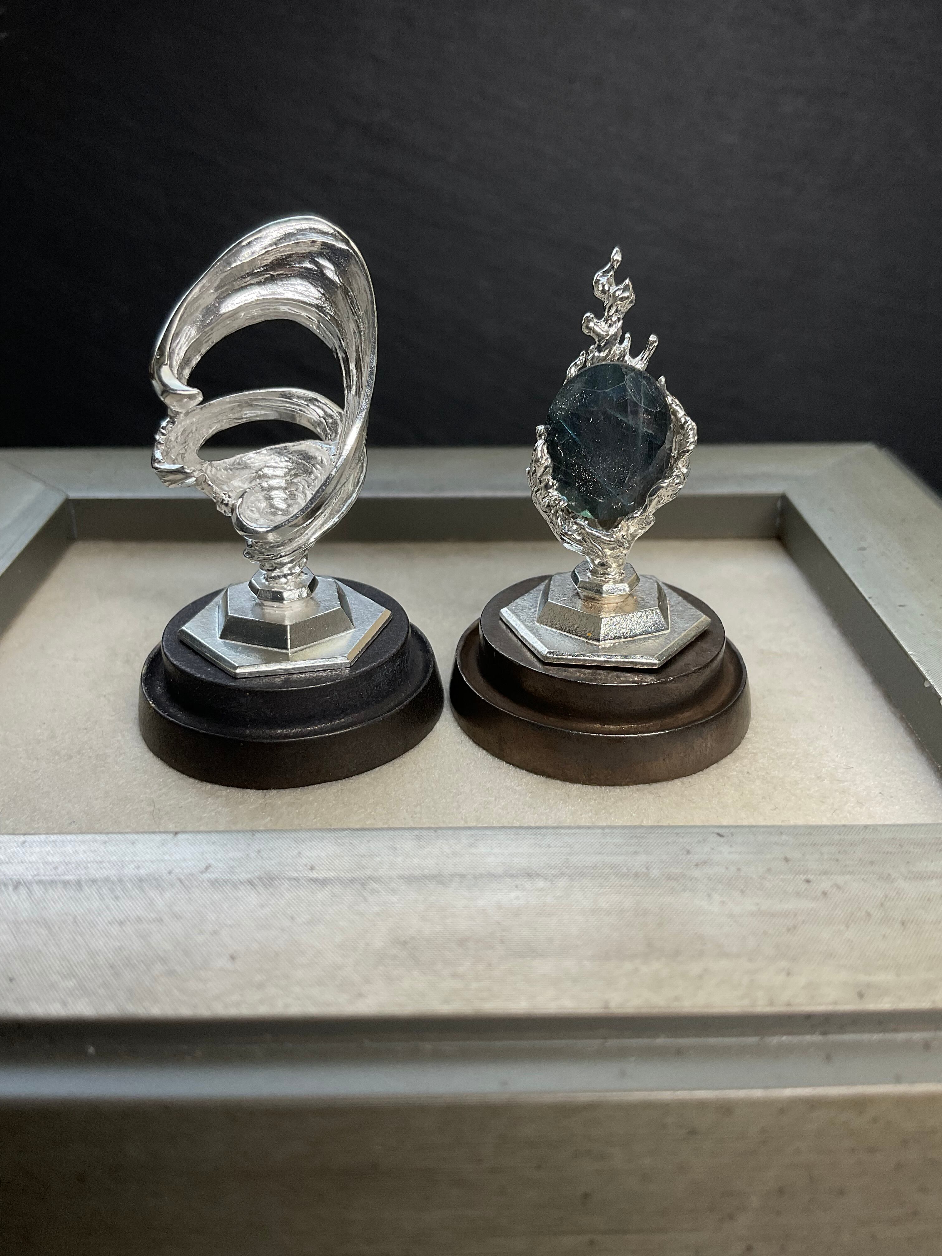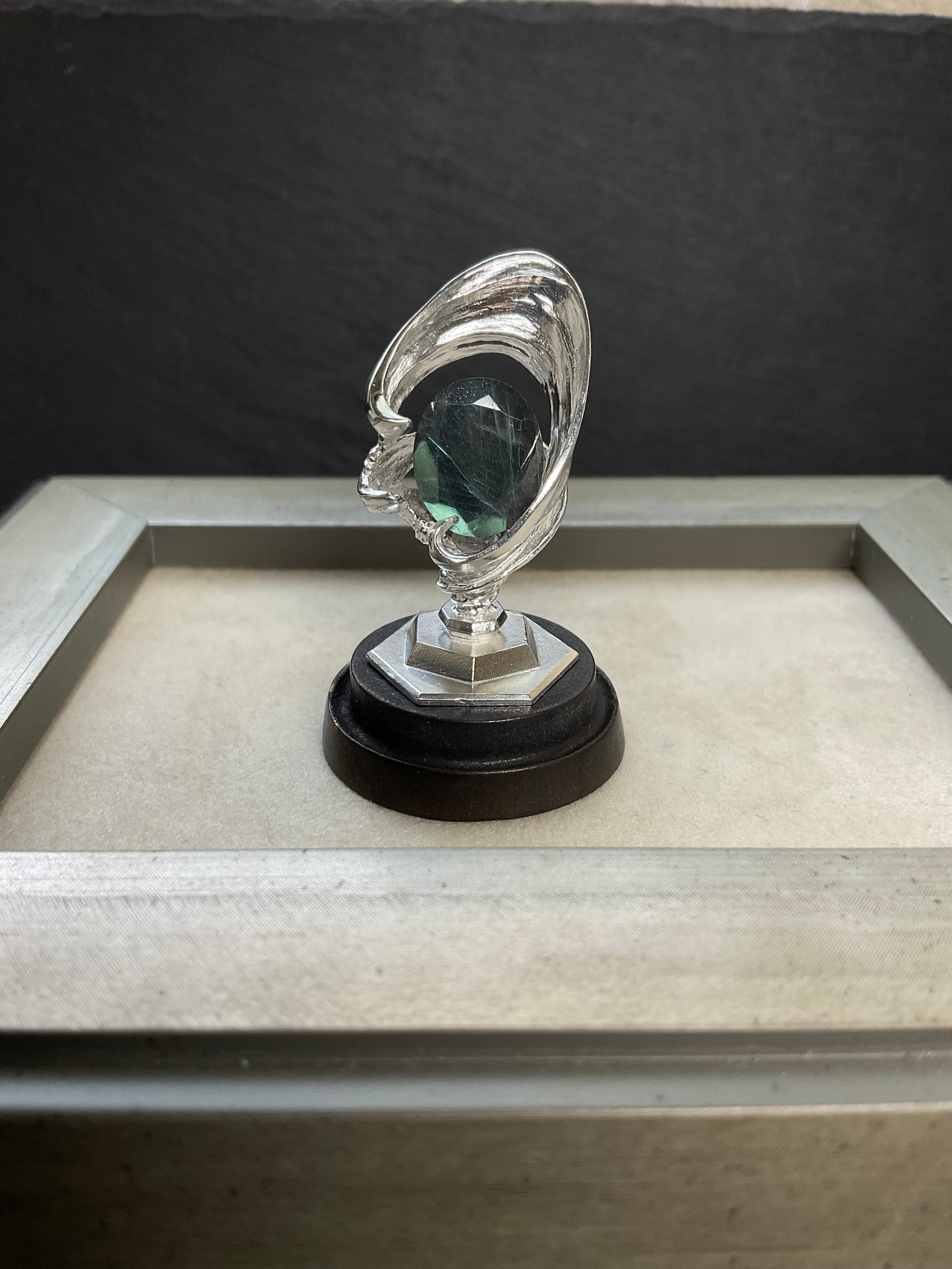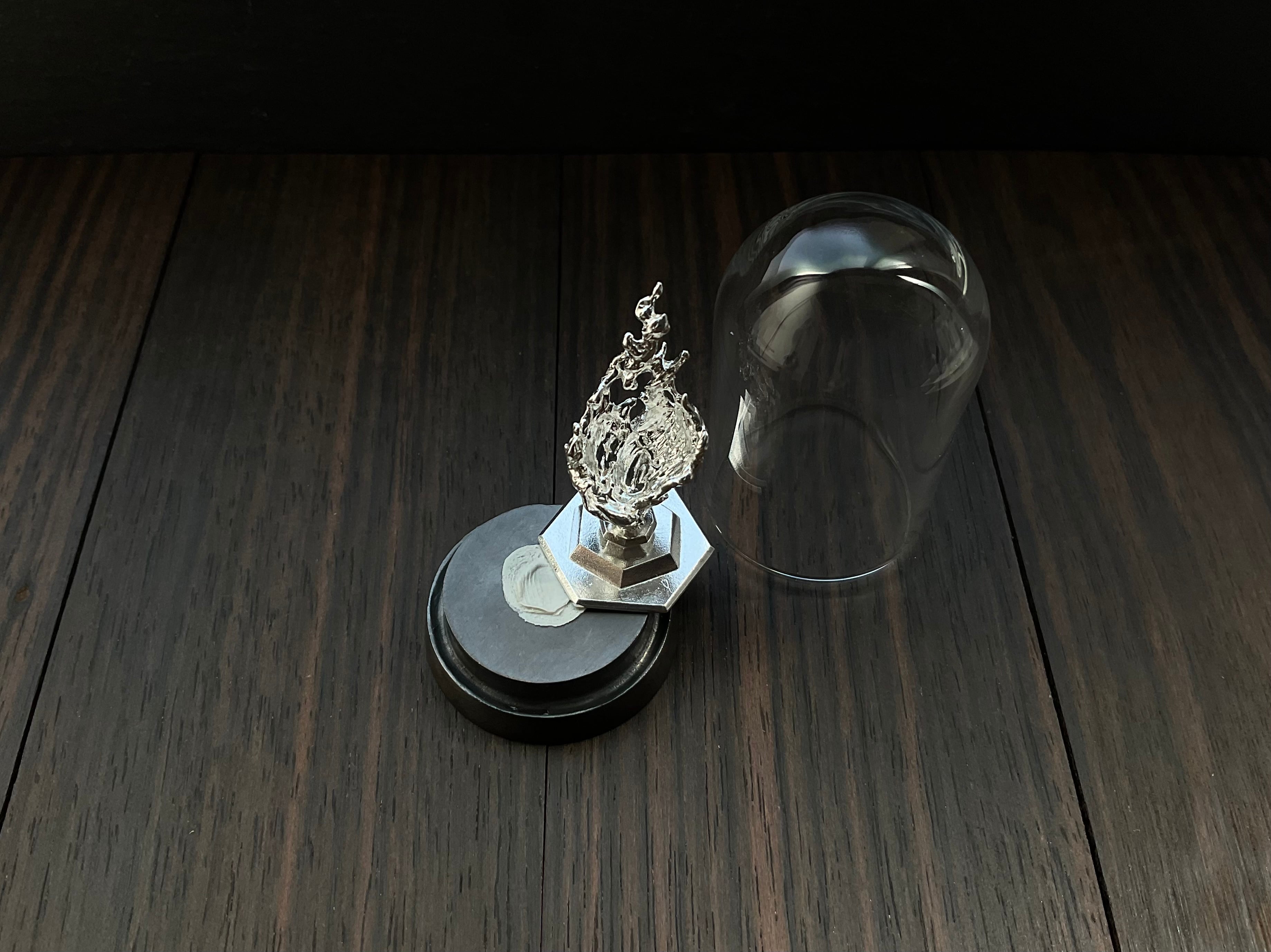 水や炎の台座より大きめのルース、鉱石が乗ります。立体的な造形の中で石の色が反射して造形の中で際立つようにと作り上げています。付属のガラスドーム使用としては内径の高さ造形としては最大です。各好きな角度から写真を撮ったり石を楽しんでいただけます。