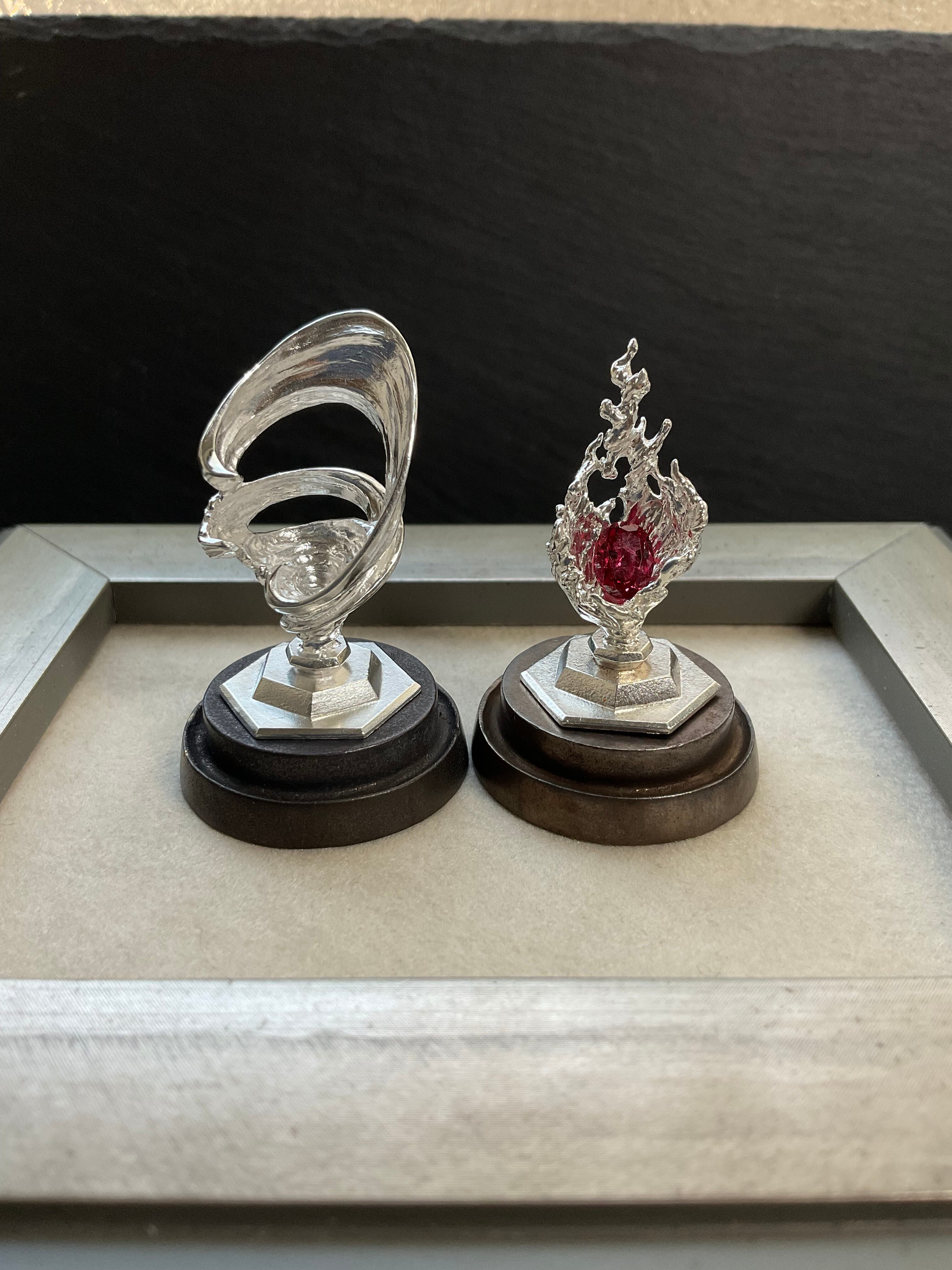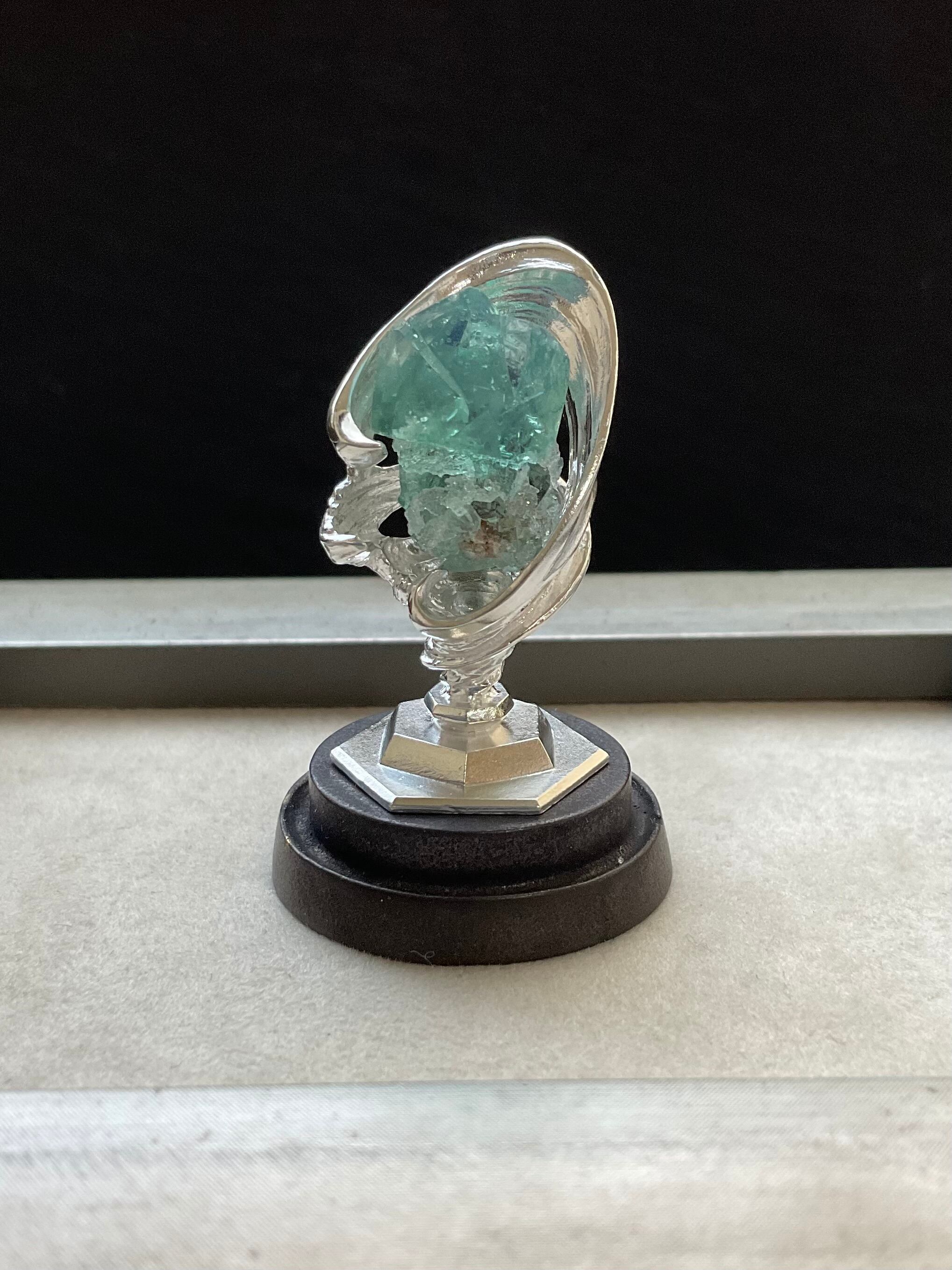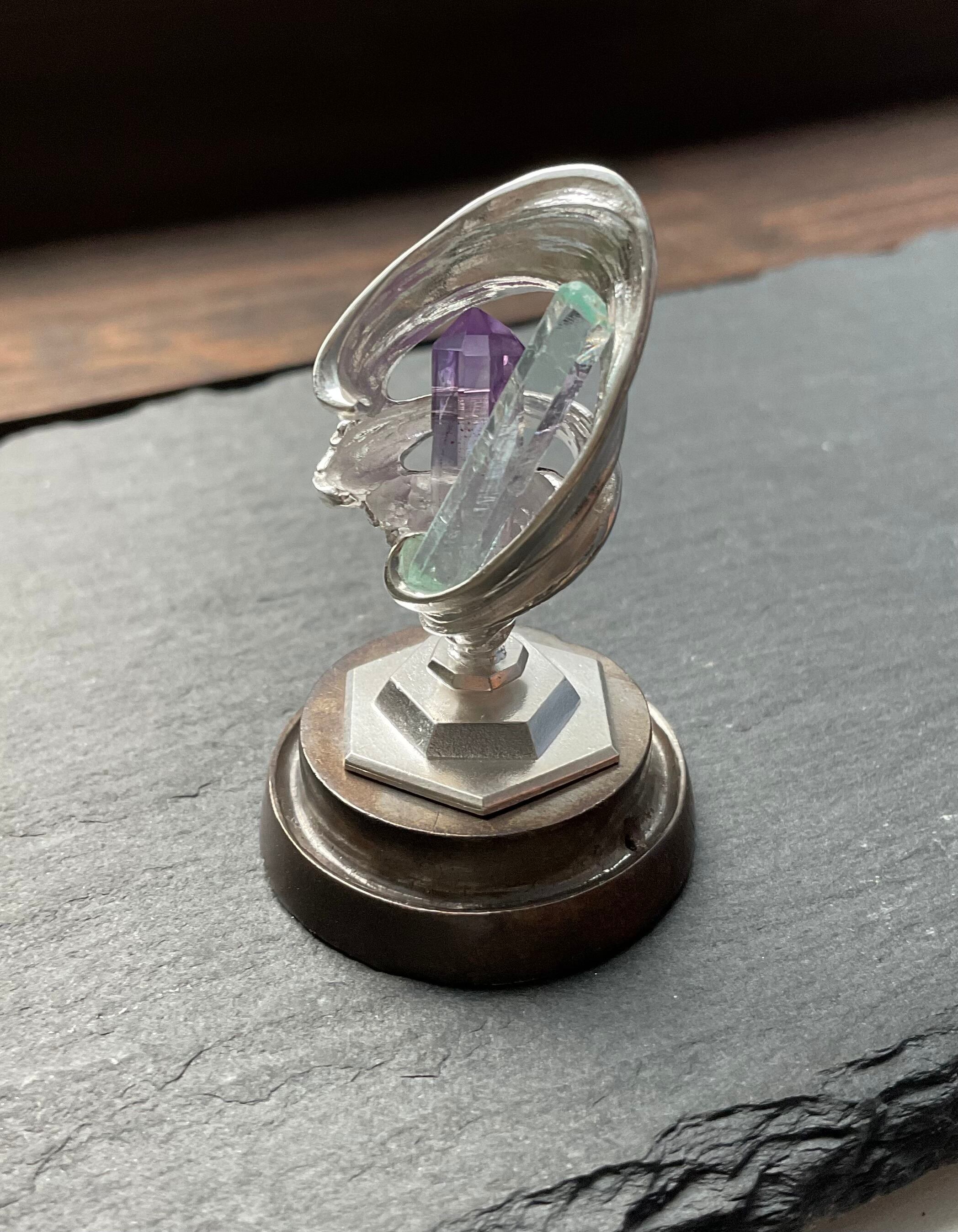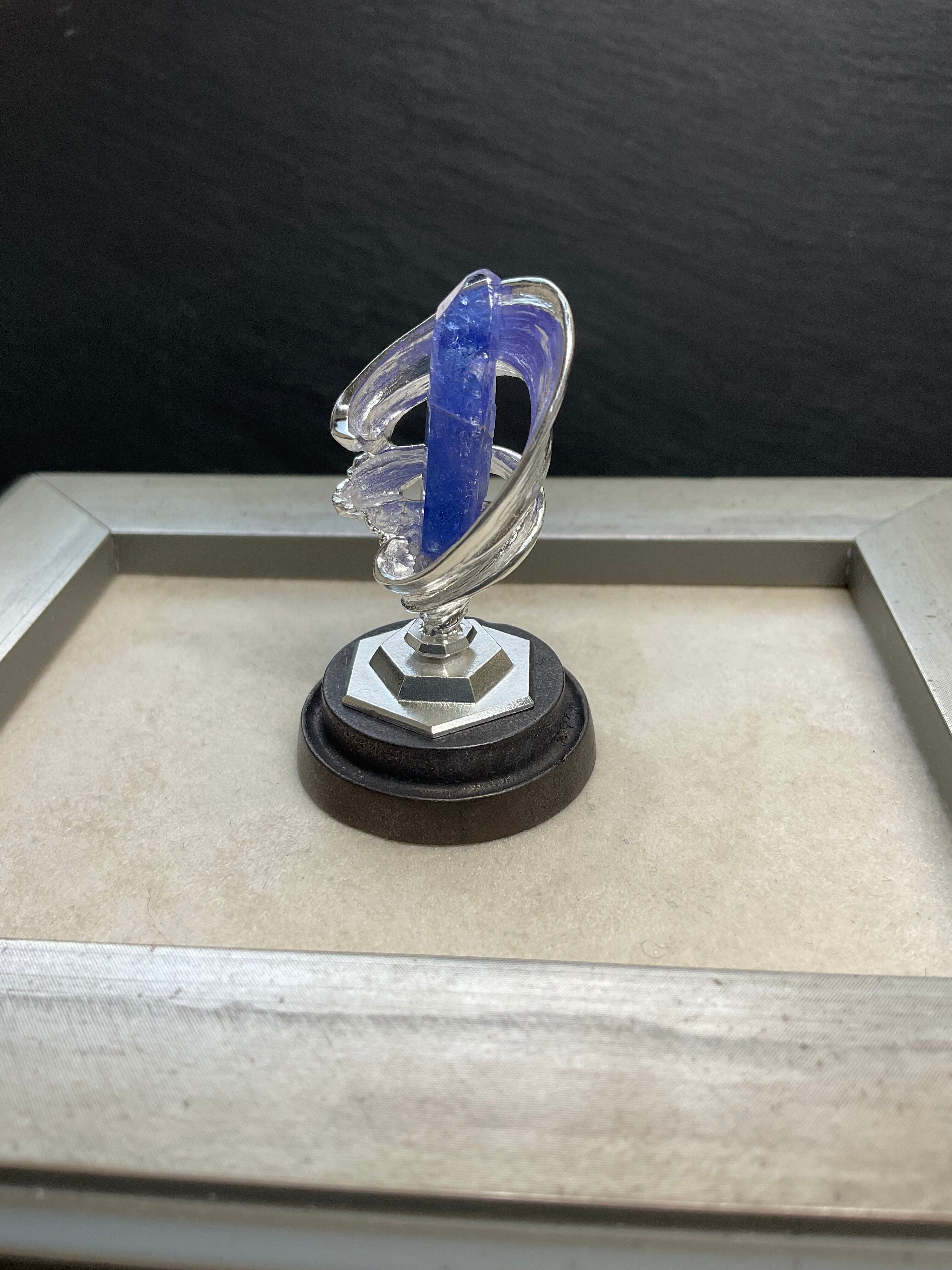水や炎の台座より大きめのルース、鉱石が乗ります。立体的な造形の中で石の色が反射して造形の中で際立つようにと作り上げています。付属のガラスドーム使用としては内径の高さ造形としては最大です。各好きな角度から写真を撮ったり石を楽しんでいただけます。
