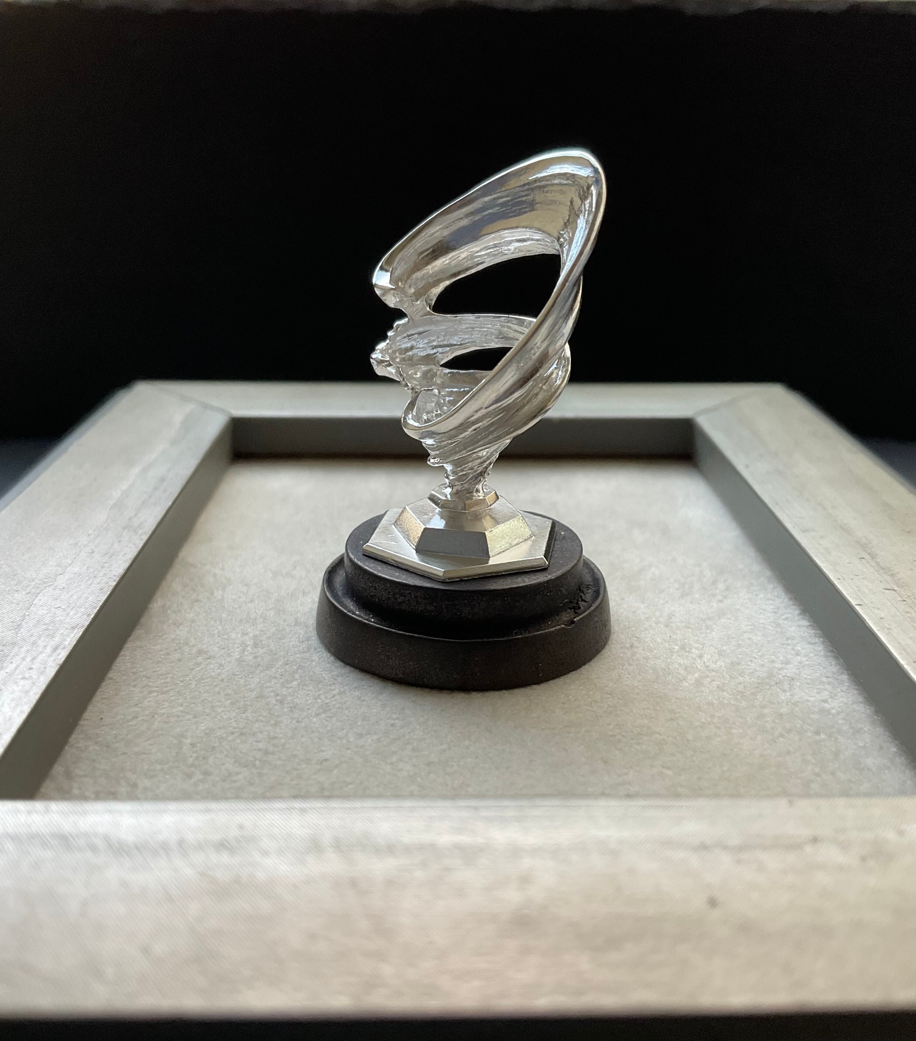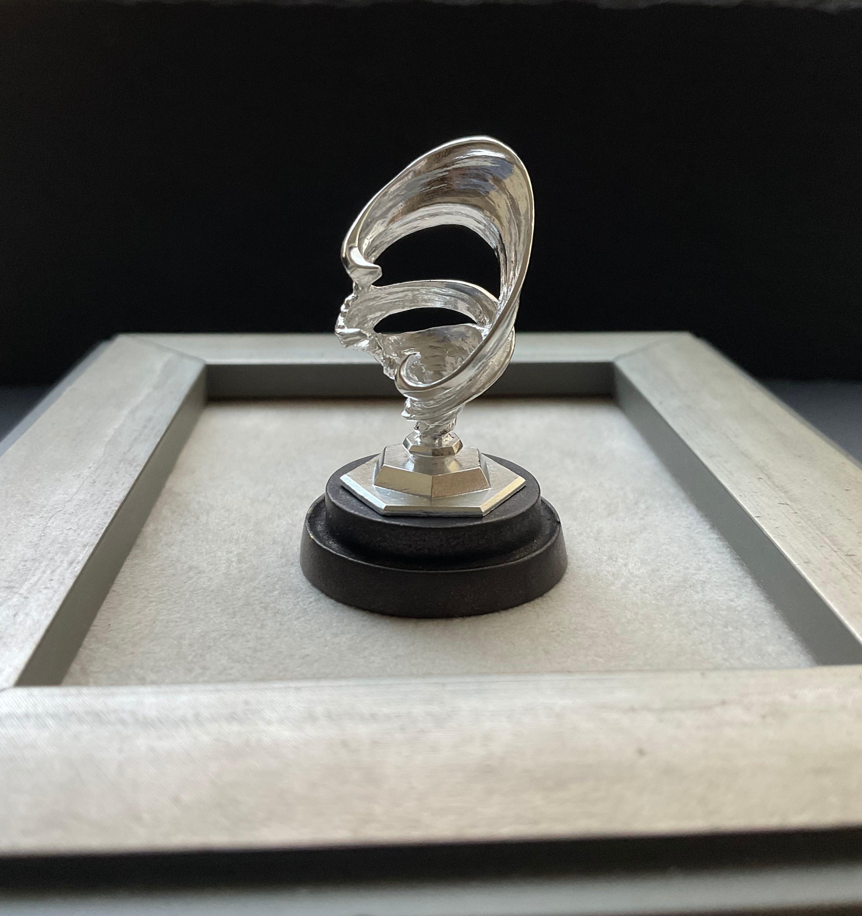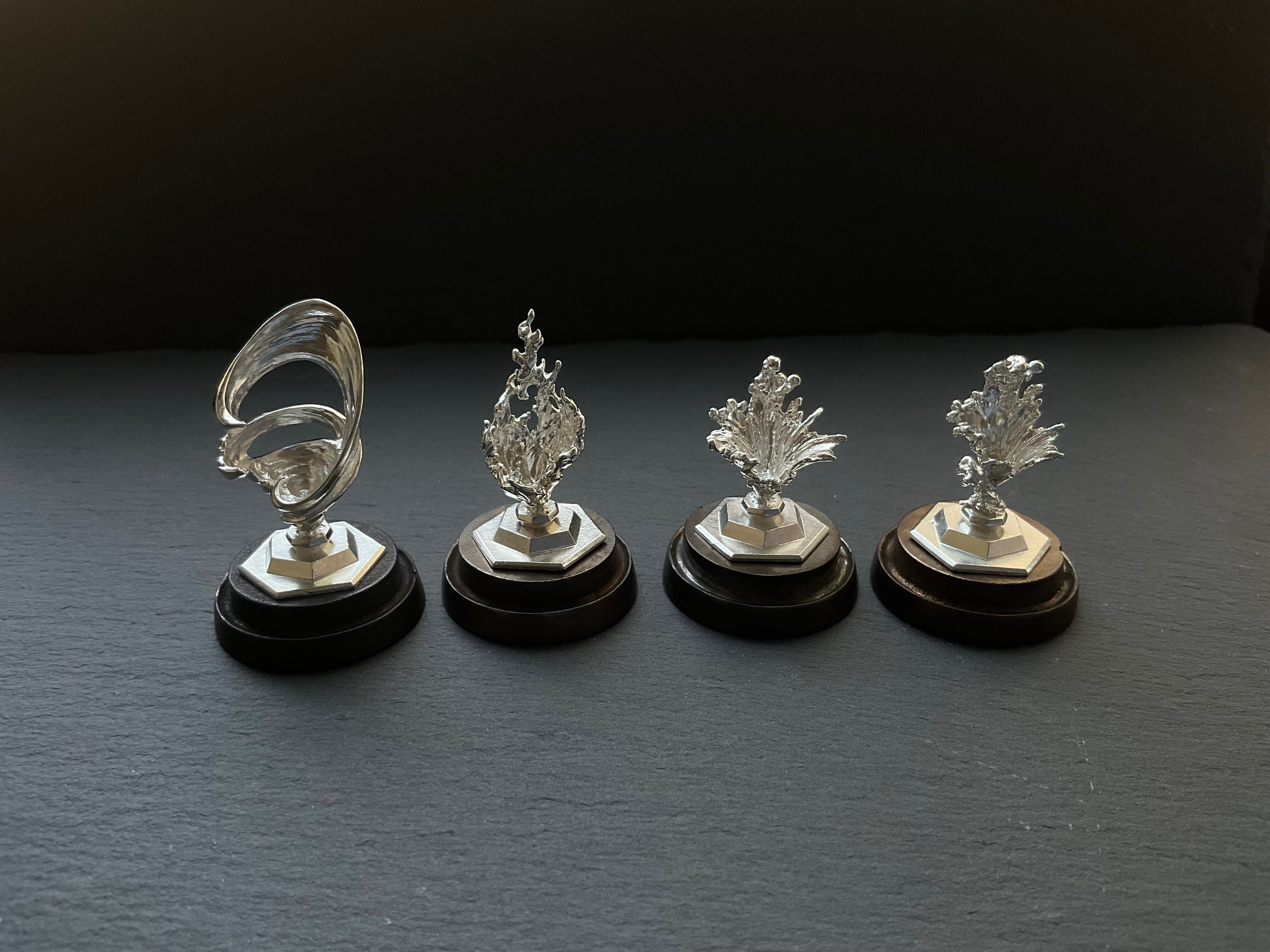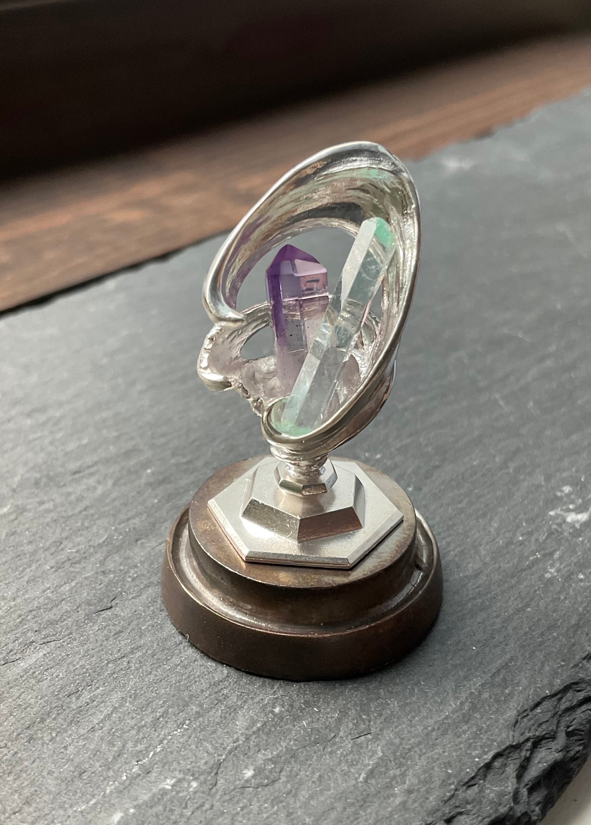 水や炎の台座より大きめのルース、鉱石が乗ります。立体的な造形の中で石の色が反射して造形の中で際立つようにと作り上げています。付属のガラスドーム使用としては内径の高さ造形としては最大です。各好きな角度から写真を撮ったり石を楽しんでいただけます。
