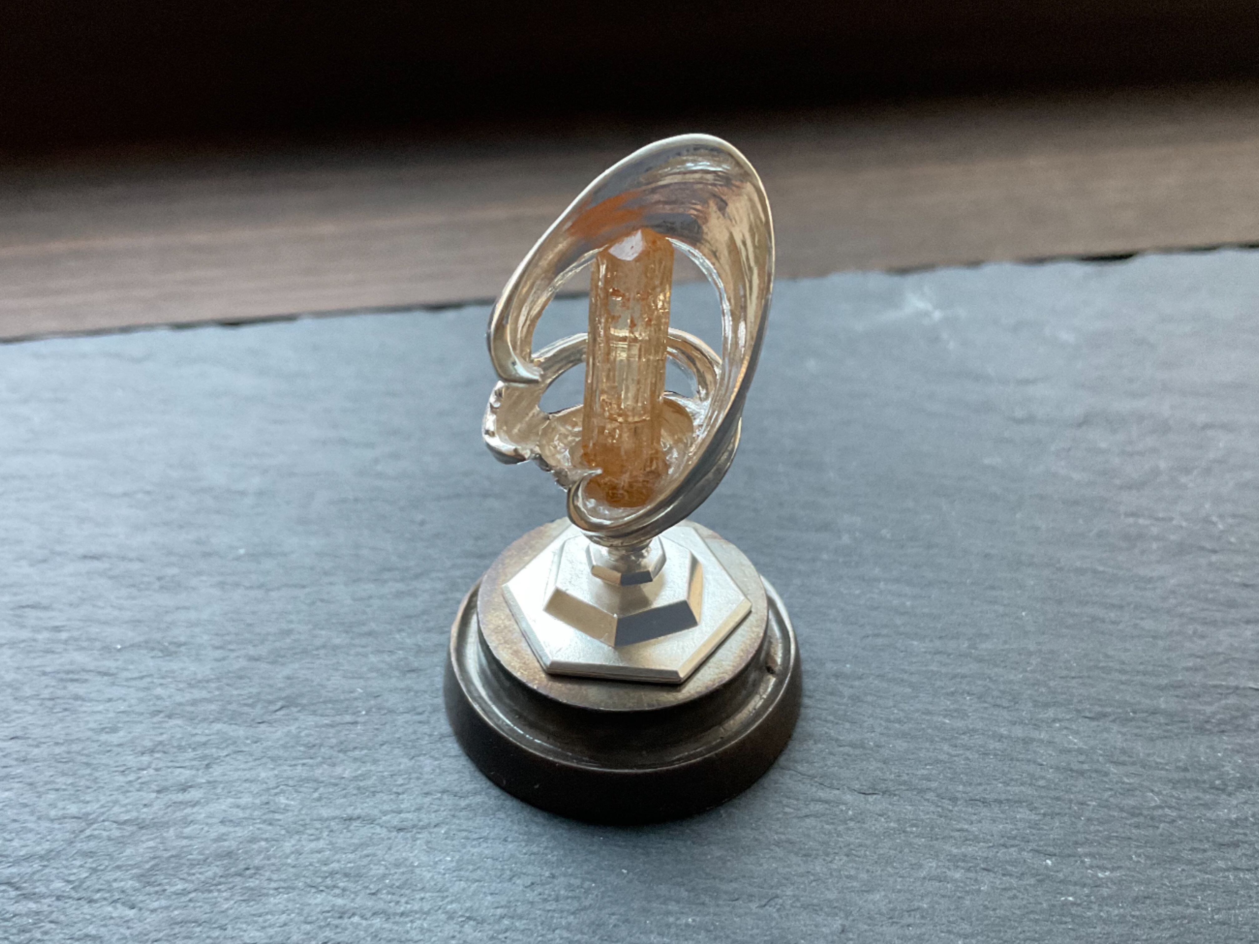 石を乗せるだけもできますが、鉱石などの落下を防ぐためにも銀台座中央の窪みにタック粘土を好みの量調整して付けて、鉱物を置くとより落ちにくくすることもできます。