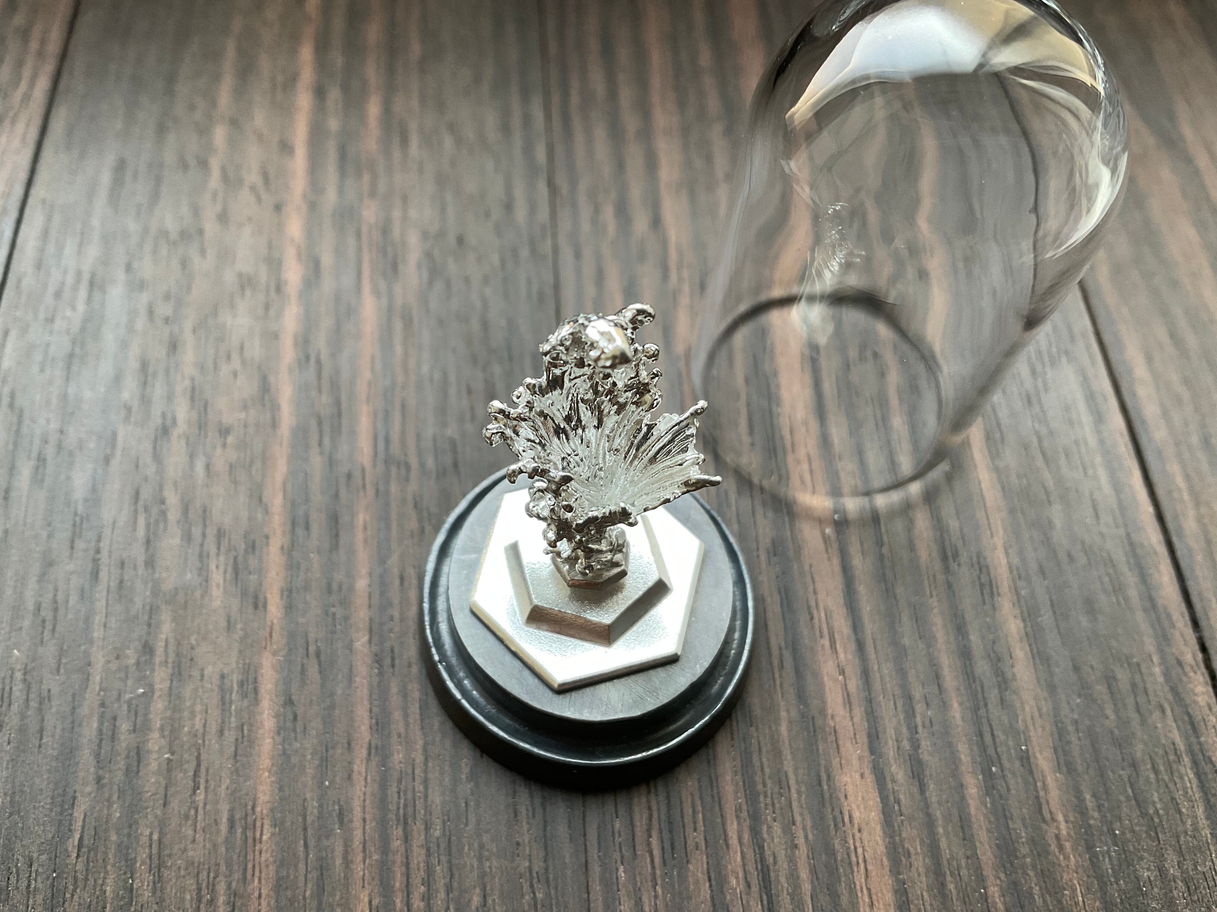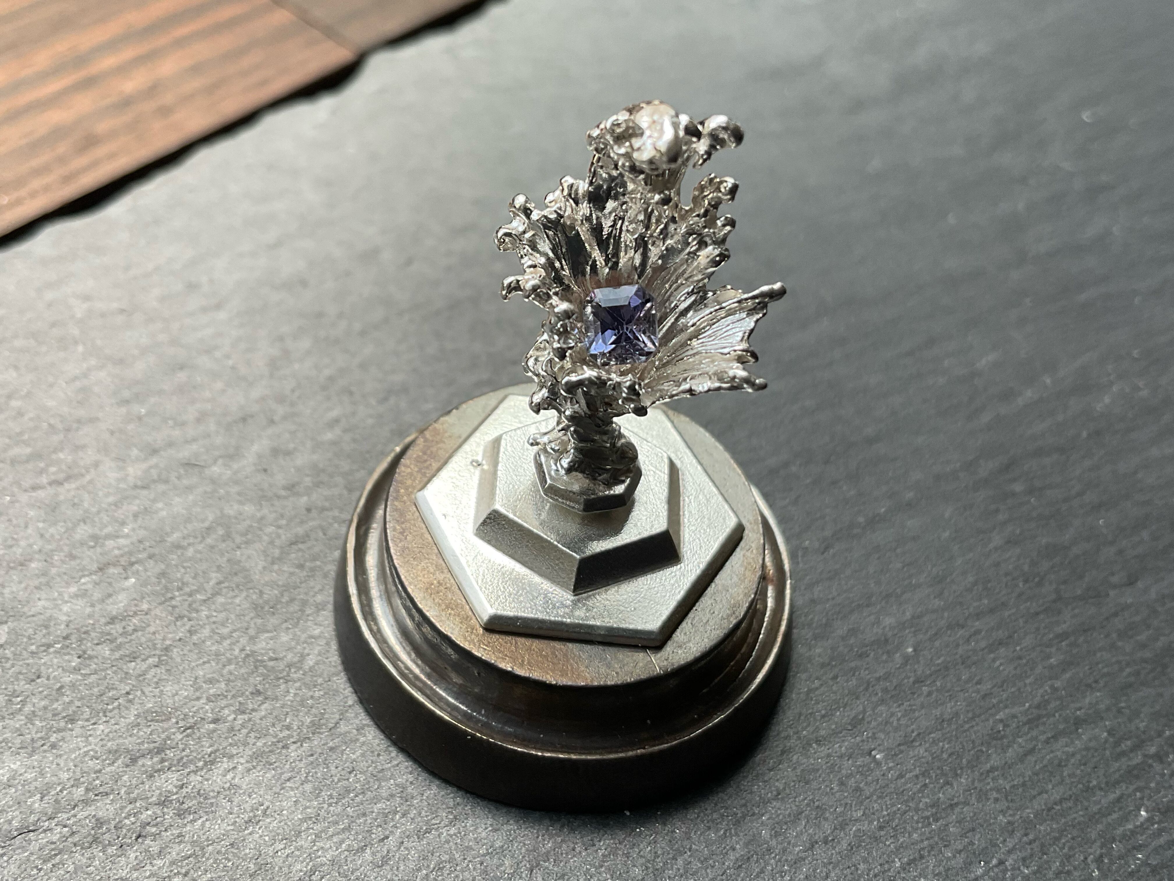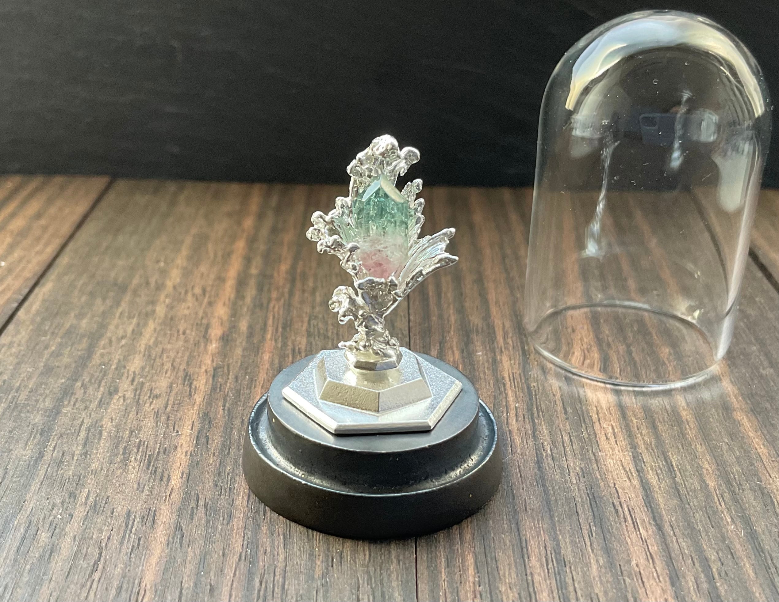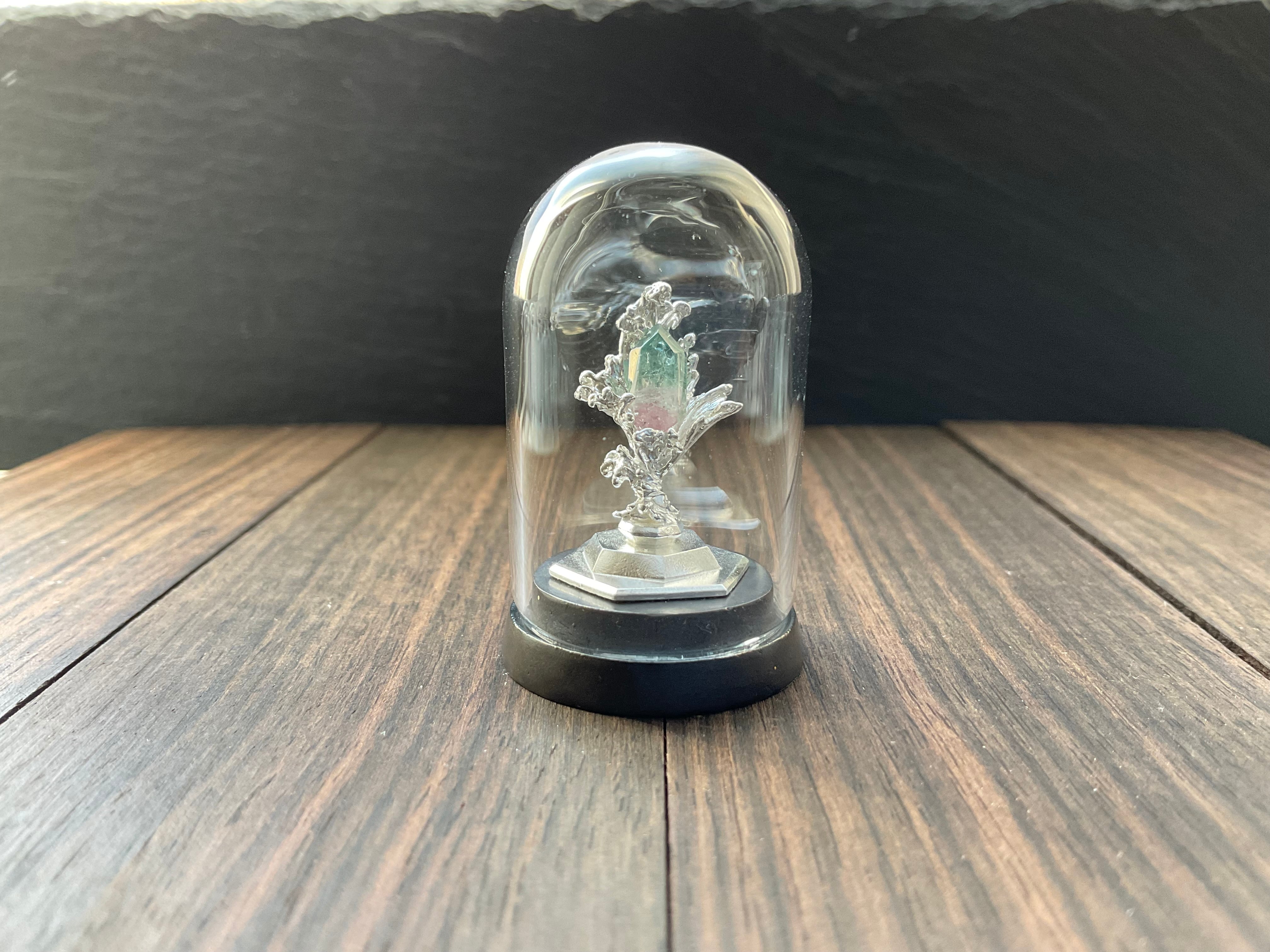 小さめのルース、鉱石が乗ります。小さい鉱石も水の反射できらめき、より際立ちます。ドームケースの裏と本体シルバー台座はタック粘土でくっついているので、手で脱着可能です。ケースに入れることでシルバーの酸化をしずらくするので、ドームを被せるか、風の当たりにくい場所での保管をお勧めします。