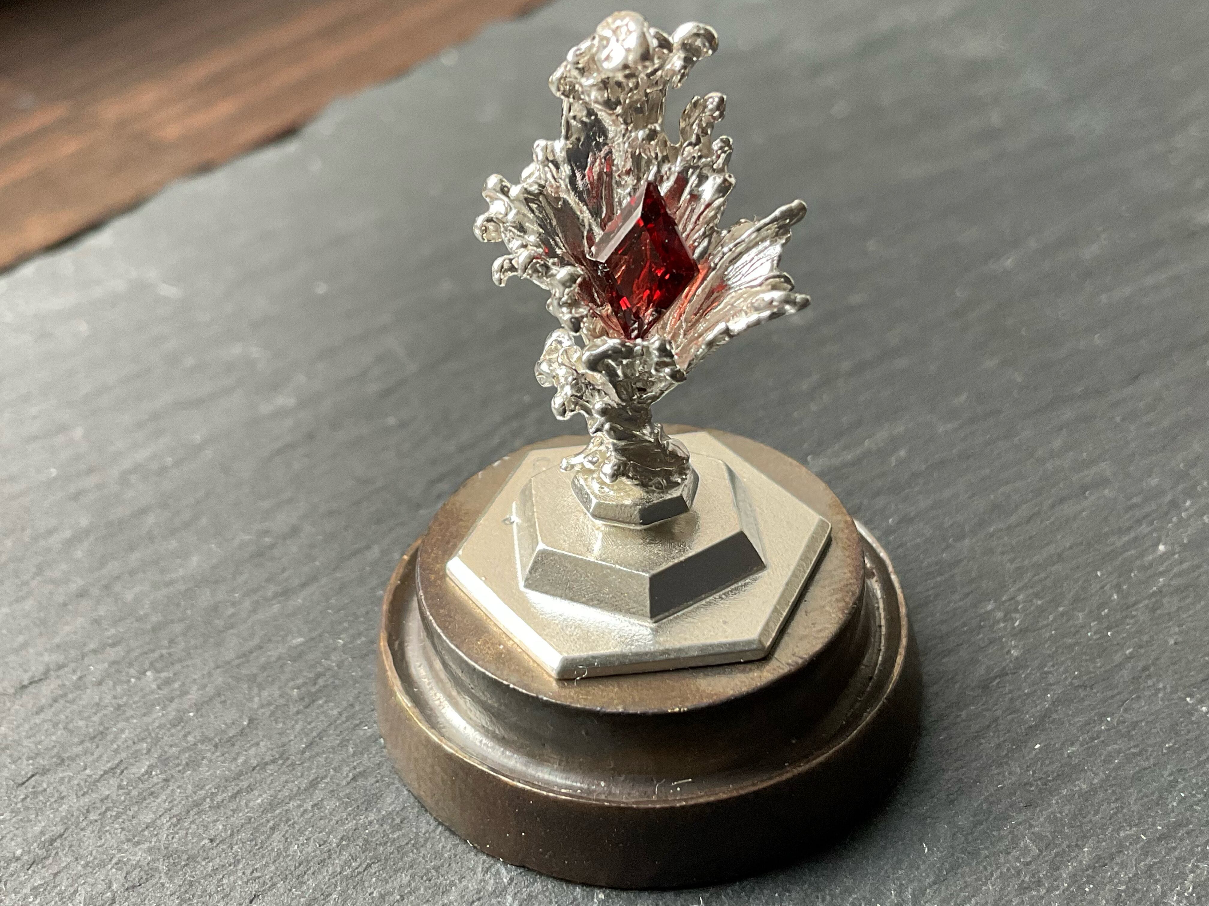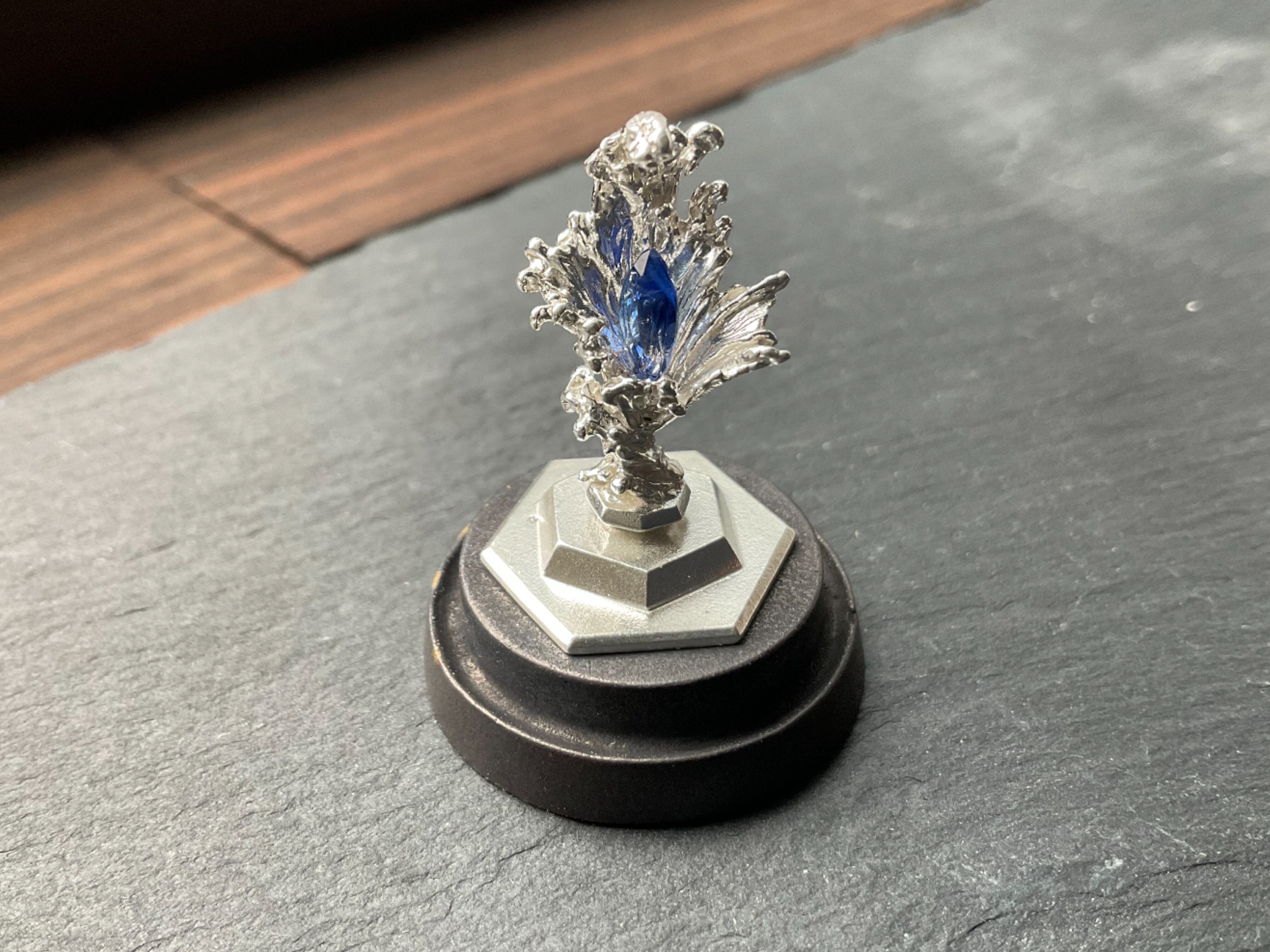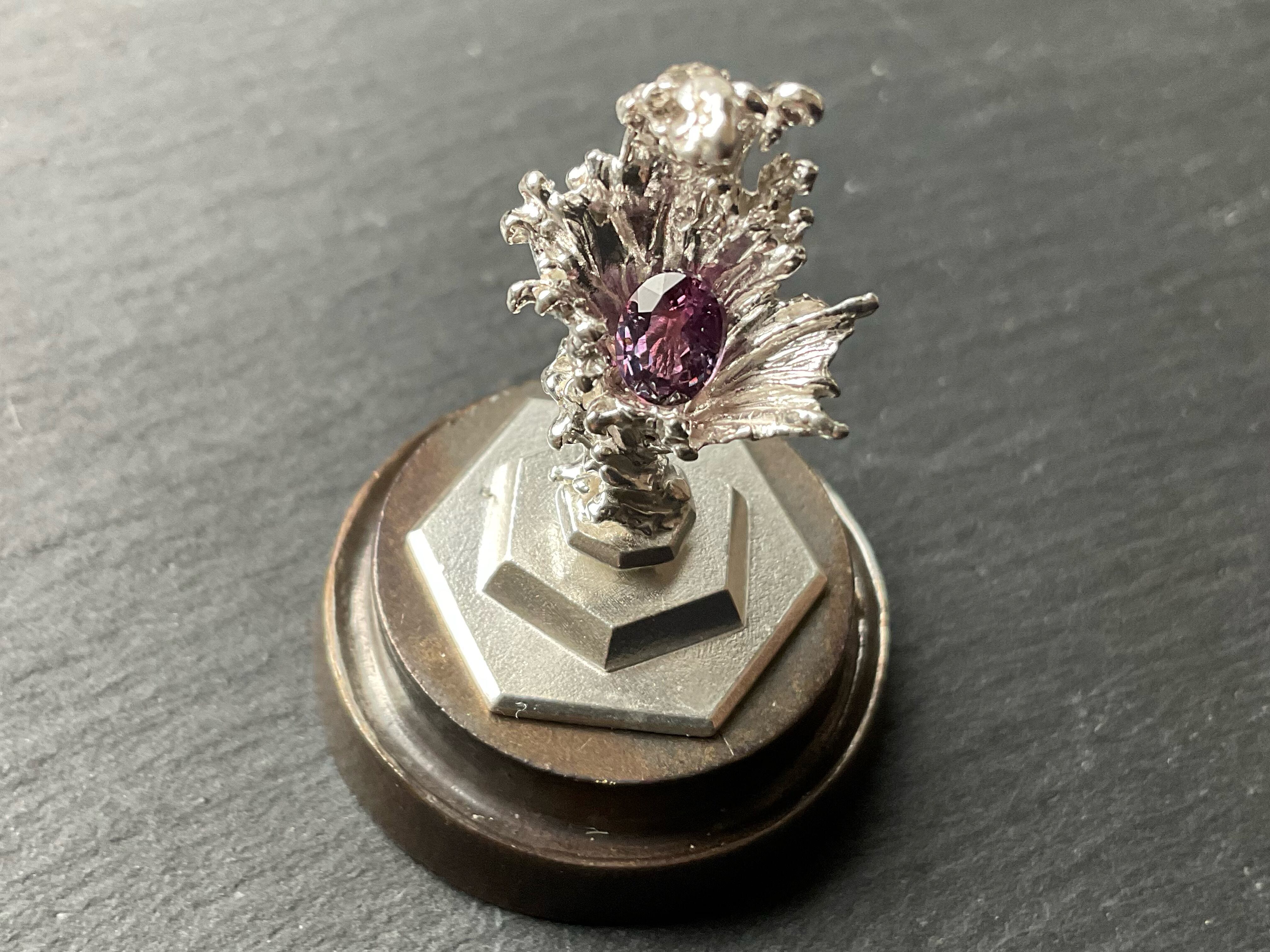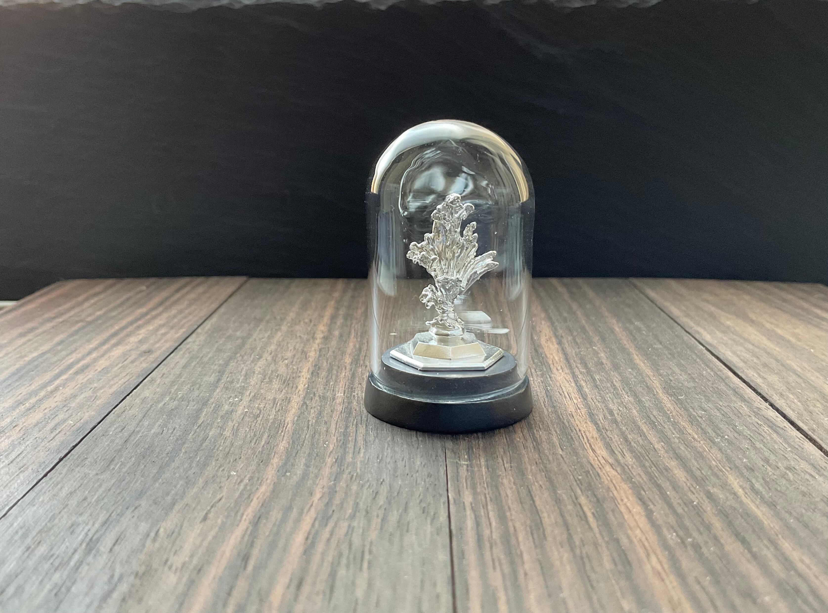 小さめのルース、鉱石が乗ります。小さい鉱石も水の反射できらめき、より際立ちます。ドームケースの裏と本体シルバー台座はタック粘土でくっついているので、手で脱着可能です。ケースに入れることでシルバーの酸化をしずらくするので、ドームを被せるか、風の当たりにくい場所での保管をお勧めします。